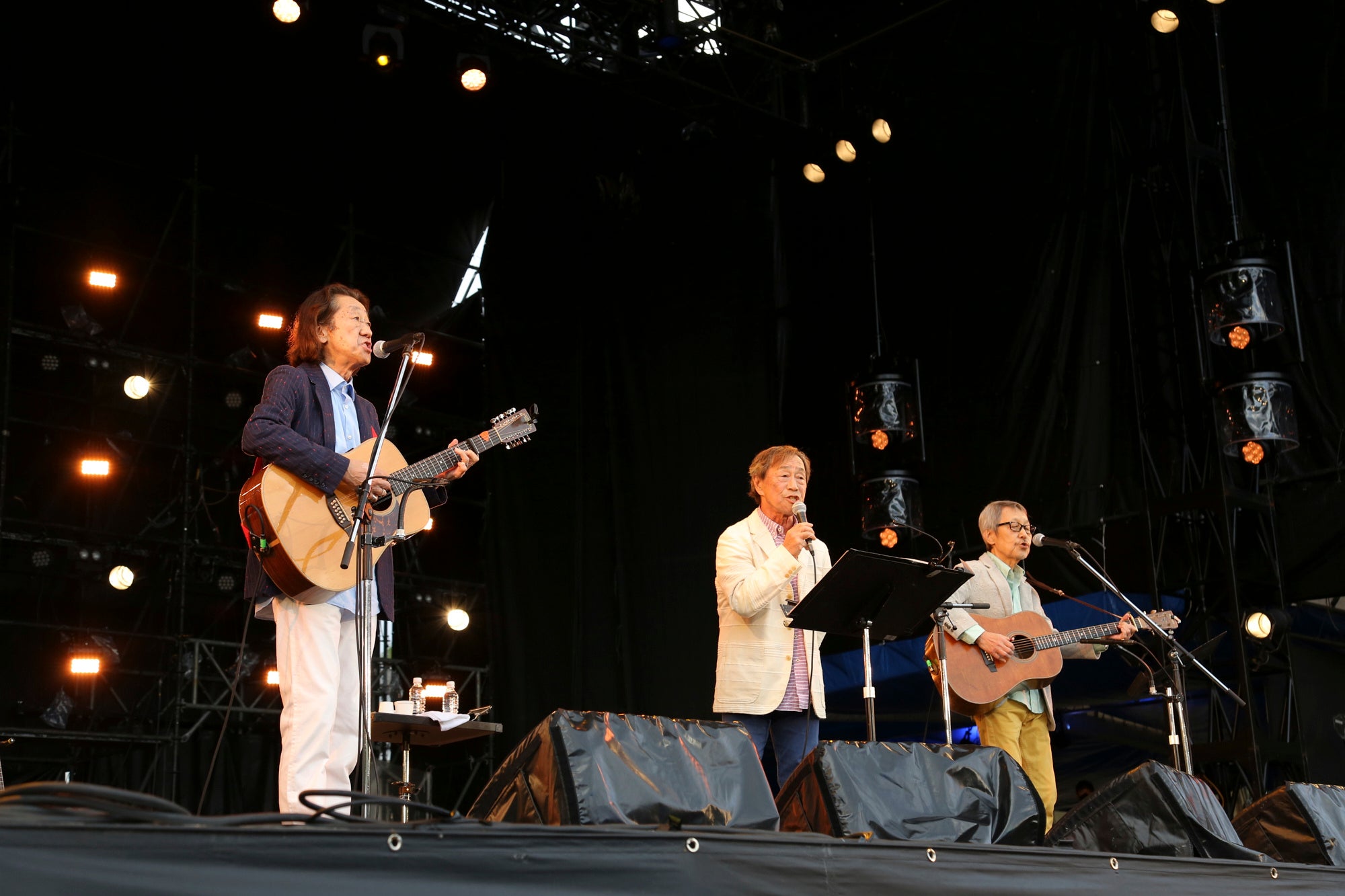 1曲目は「野原の上の雨になるまで」。続いて「風に吹かれて 再会篇」を歌うと、旧知の仲である海援隊を呼び込み、「旅人よ」をコラボ。さらに翌日に出演予定のwacciの橋口洋平を呼び込み、「神田川」をコラボ。