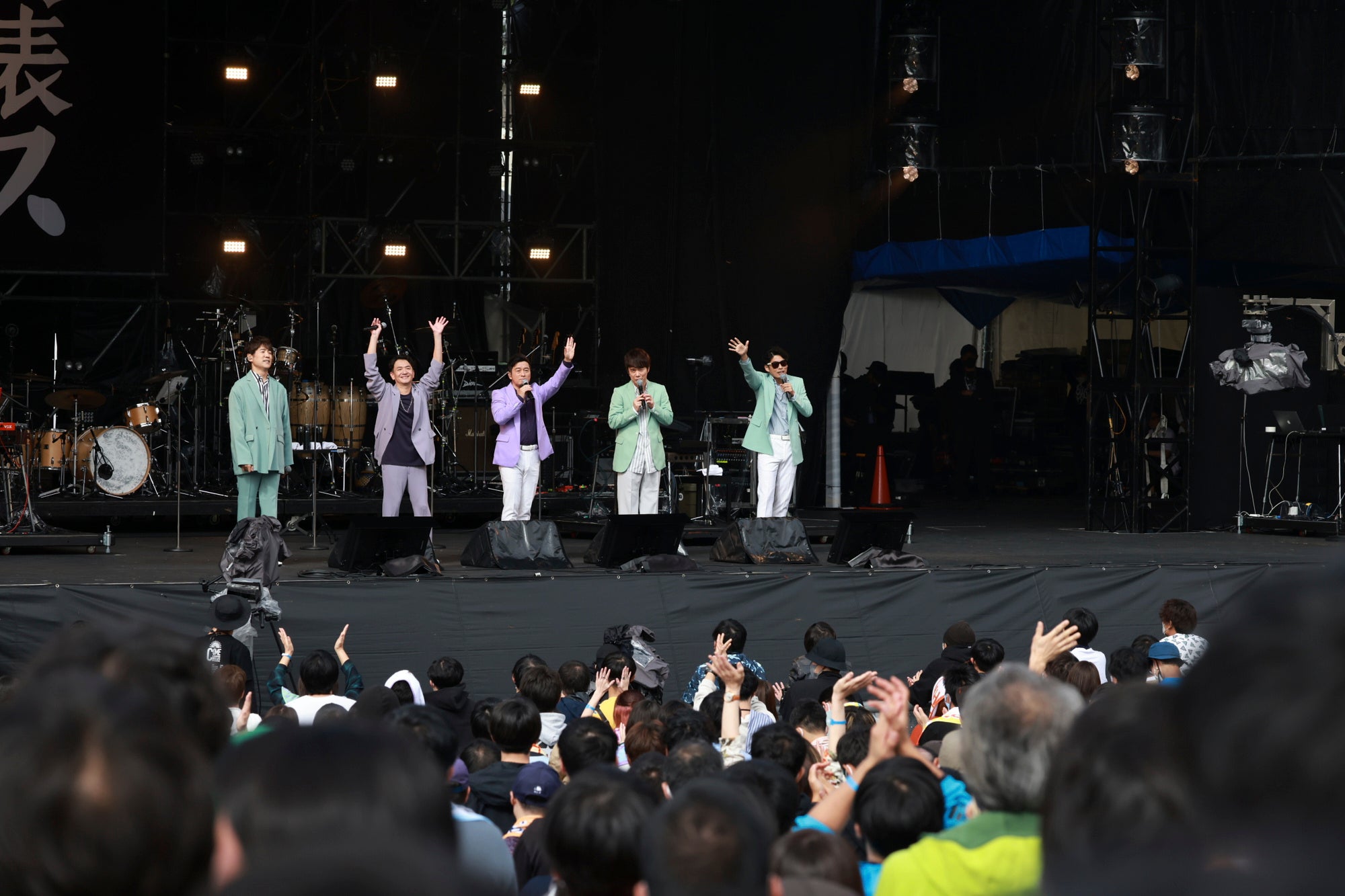 グリーンとパープルの清涼感のある衣装でゴスペラーズが登場。1曲目「いろは 」をアカペラで。続いてAIの「アルデバラン」、小田和正の「たしかなこと」をカバー。「カバーを2曲聴いてもらったので、次はオリジナルを。ずっと同じ仲間で歩き続けた僕らの気持ちがたっぷり詰まった曲です」と、聴かせてくれたのは「星屑の街」。