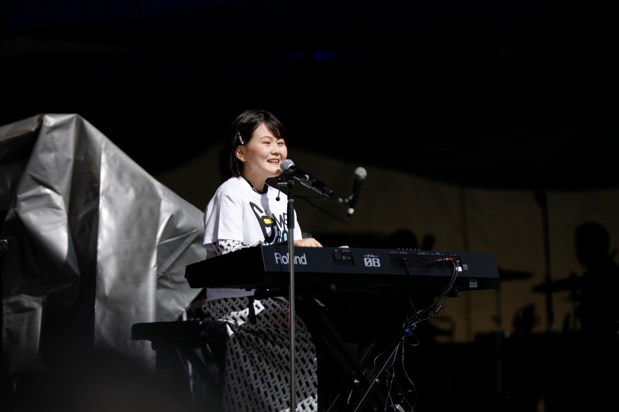 シティポップを基調にロック、ファンク、R&Bを取り入れ、新しい音楽を作り続けているAwesome City Club。「せっかく晴れたので、心地いい曲を聴いてもらおうかな」というatagiの一声で、「Life still goes on」がスタート。続けて「アウトサイダー」、「今夜だけ間違いじゃないことにしてあげる」、「夏の午後はコバルト」、「Good Morning」とAwesome City Clubの世界がステージに繰り広げられる。
