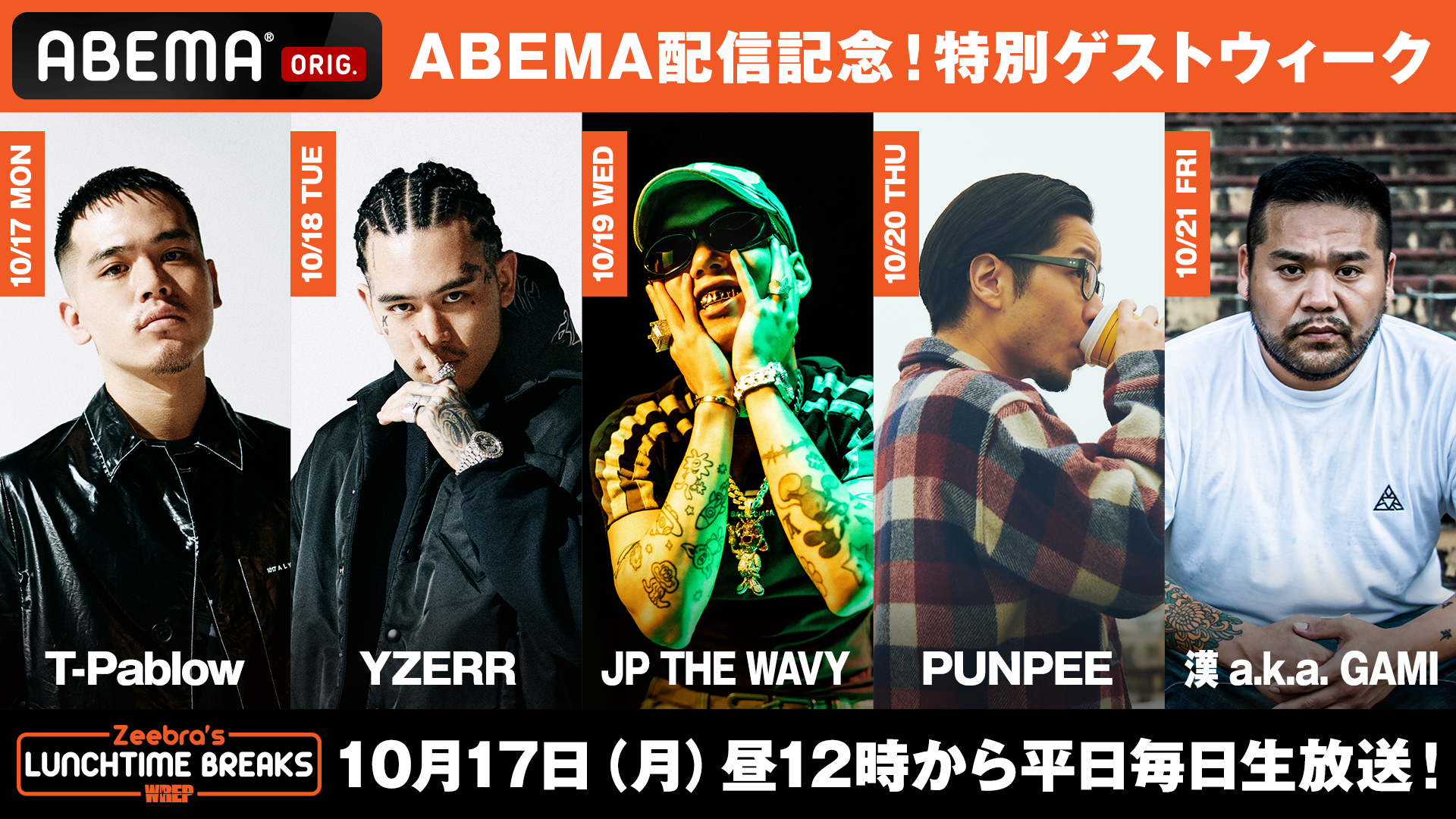 そして、同時放送の初回放送となる10月17日(月)にはT-Pablow (BAD HOP)、翌18日(火)はYZERR (BAD HOP)、19日(水)はJP THE WAVY、20日(木)はPUNPEE、21日(金)は漢 a.k.a. GAMIと、豪華メンバーのゲスト出演も決定。Zeebraとゲストによる熱いHIP HOPトークはもちろん、ニュースや時事問題も絡めたホットな話題をお届けする本番組をぜひお楽しみください。
