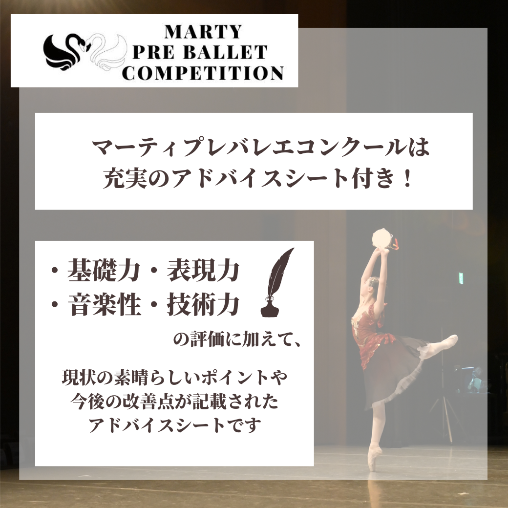 マーティプレバレエコンクールでは、基礎力・音楽性・身体能力・芸術性・テクニック面を総合的に審査し、コンクールを通して次のステップアップにつながる機会を与え、将来性のあるバレリーナを支援するコンクールです。