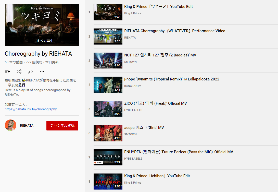 そして、ファンからのリクエストが多かった「コレオグラフィーを集めたプレイリスト」が、遂にRIEHATA自身のアカウントで公開。