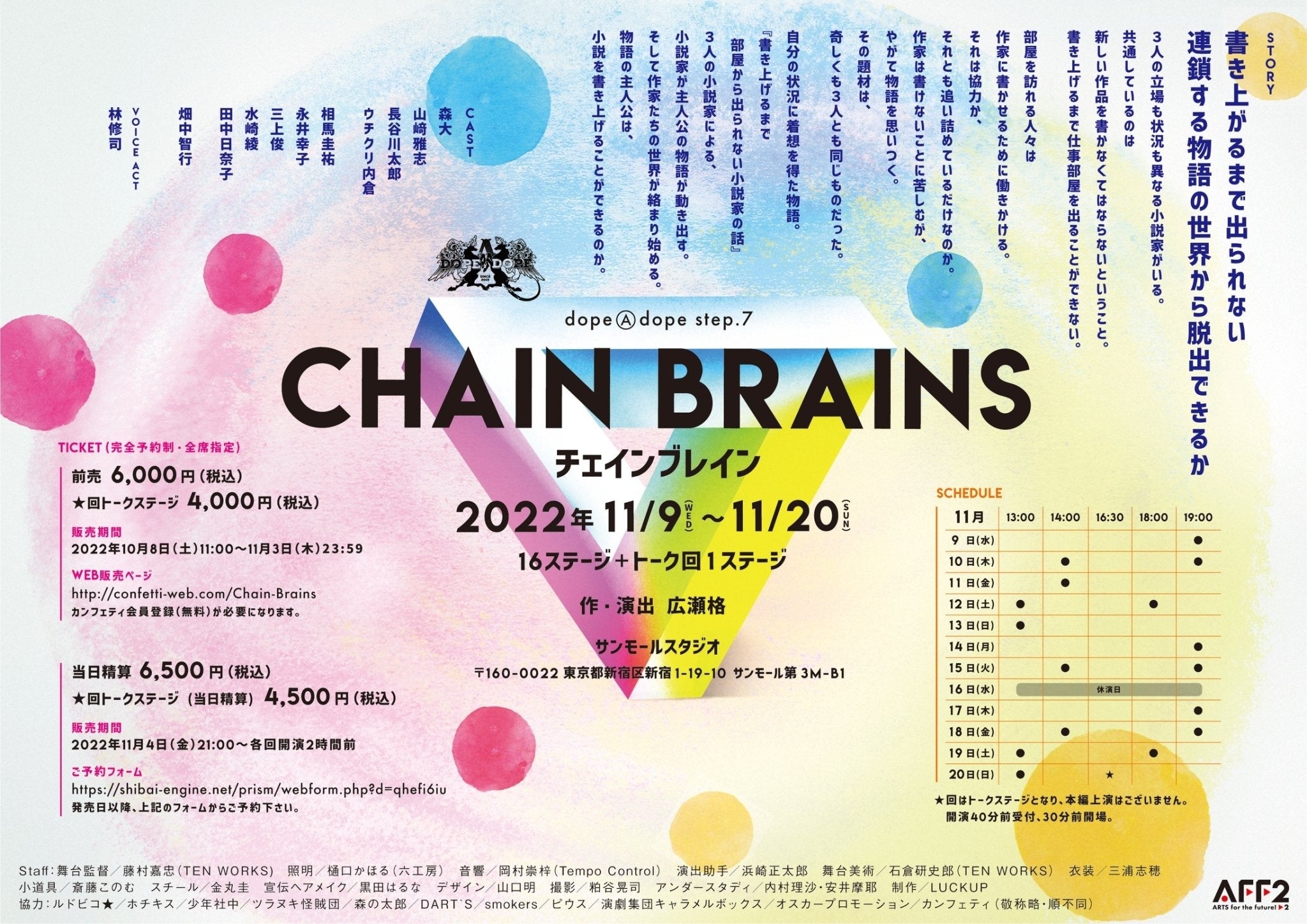 dopeAdope『チェインブレイン』が2022年11月9日(水)~11月20日(日)にサンモールスタジオ(東京都練馬区)にて上演されます。チケットはカンフェティ(運営:ロングランプランニング株式会社、東京都新宿区、代表取締役:榑松 ⼤剛)にて10月8日(土) 11:00 より発売開始です。