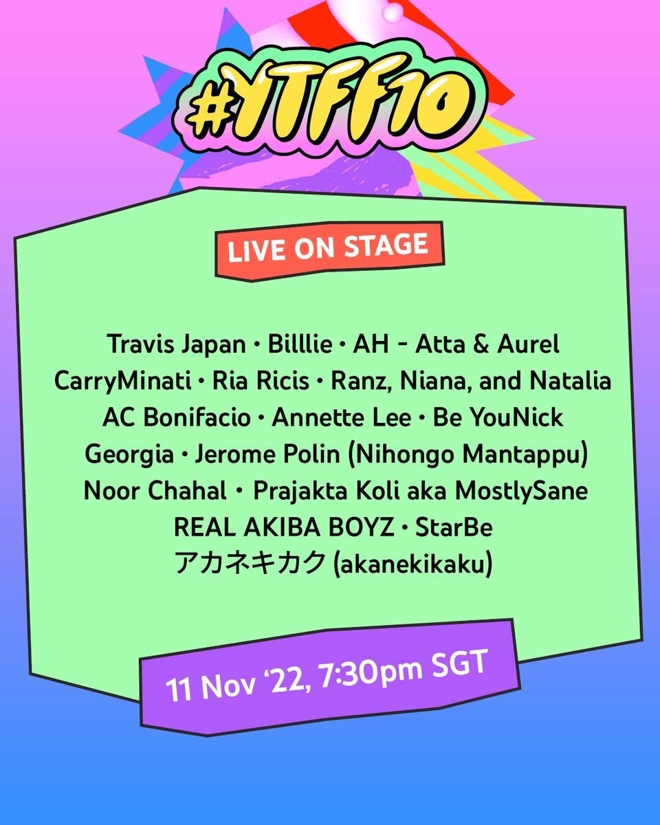 今年2022年の「YouTube FanFest 10」(公式ハッシュタグ #YTFF10 )は、インド共和国・マレーシア共和国・そしてREAL AKIBA BOYZほか日本語圏のYouTuberが出演するシンガポール共和国の3か国で開催される。