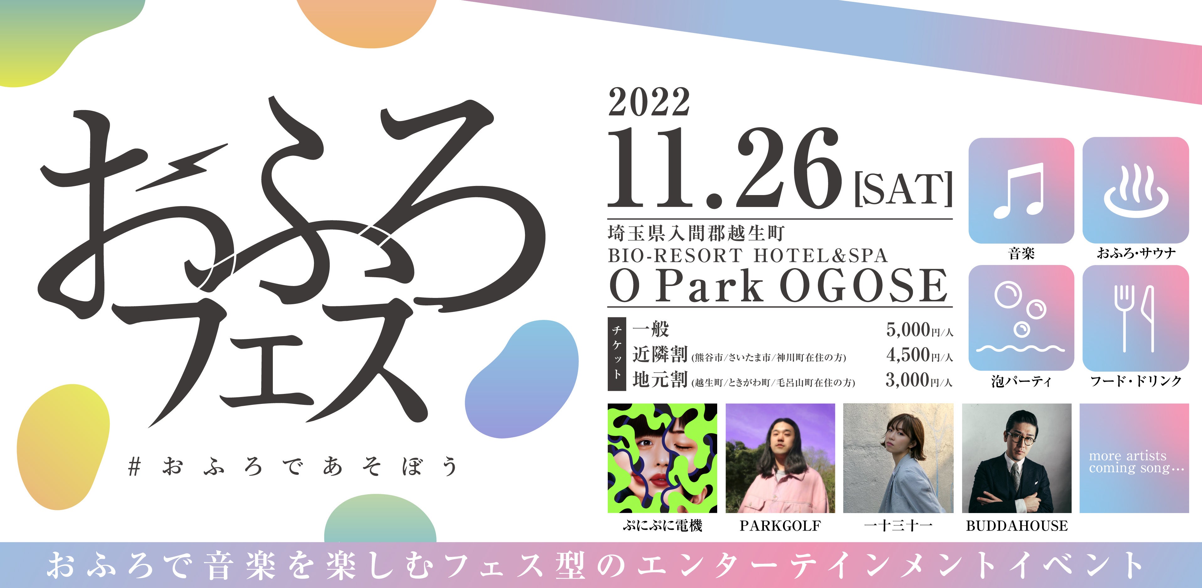 株式会社温泉道場(埼玉県比企郡ときがわ町、代表取締役 山崎寿樹)が運営する「BIO-RESORT HOTEL&SPA O Park OGOSE」(以下、オーパークおごせ)は、2022年11月26日(いい風呂の日)に開催する、おふろ×音楽をテーマにしたイベント「おふろフェス」の参加アーティスト決定、ならびにチケット販売開始をおしらせします。