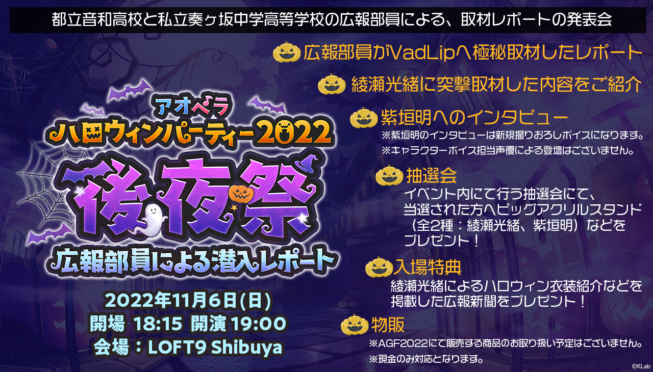 後夜祭では、都立音和高校と私立奏ヶ坂中学高等学校の広報部員による、宗円寺家のハロウィンパーティ潜入取材レポートを発表するほか、紫垣明(CV.浦田わたる)へのインタビューやVadLipへの極秘取材も計画中とのこと!