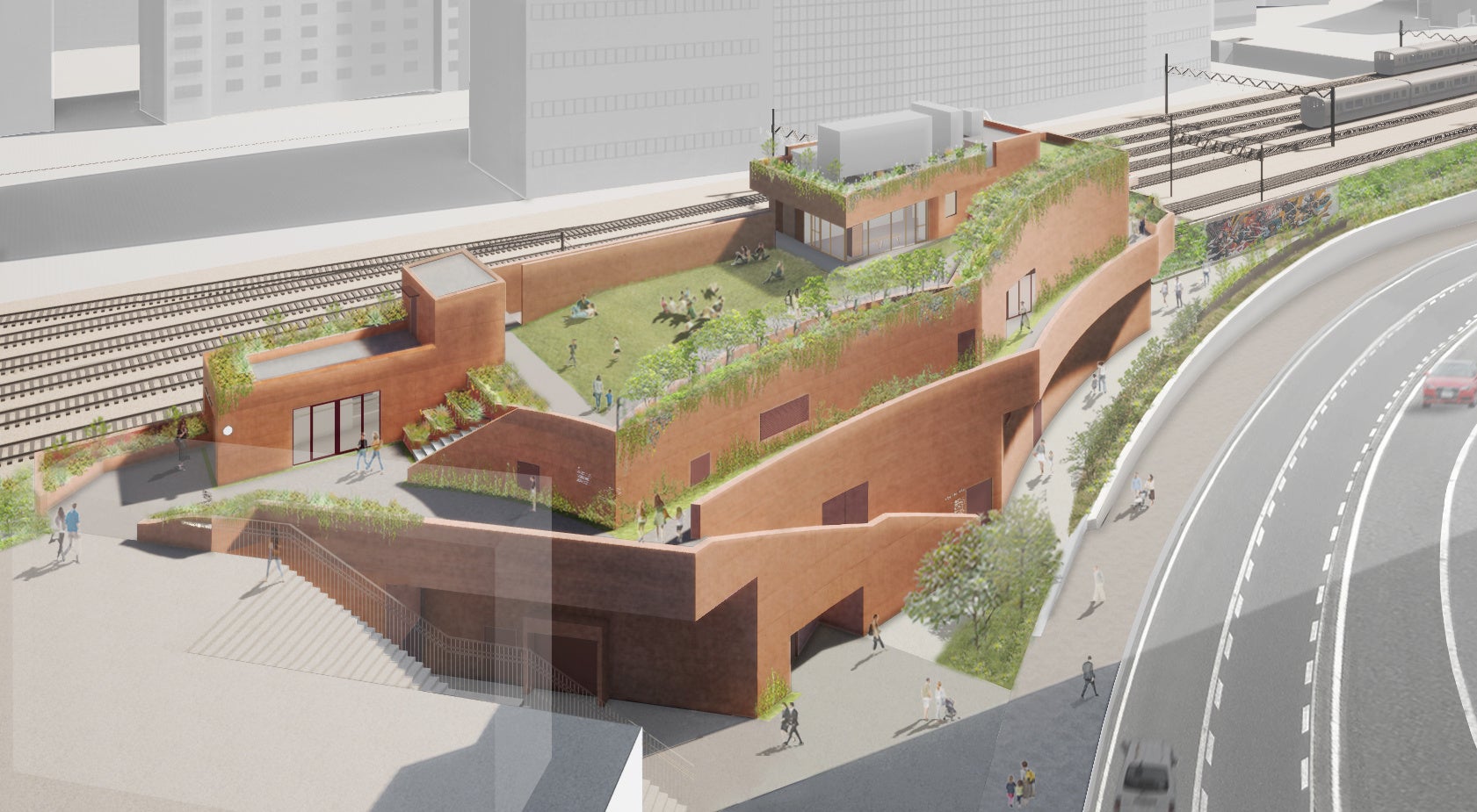 敷地面積約1027平方メートル、延床面積約1580平方メートル地上4階(高さ約14メートル)。川崎市がすすめる「緑のまちかわさき」「音楽のまちかわさき」をそのまま建物コンセプトに。川崎駅改札口からペデストリアンデッキ経由で、雨に濡れずに施設まで安全に往来できる。主に音楽ライブハウスとなる大ホール、催事・会議などに使える小ホール・多目的スペース。屋上広場は芝生を敷き詰め、誰もが自由に過ごせるスペース。その脇に軽食コーナーを設ける。災害時を想定した防災備蓄倉庫も設置、避難所としての利用も可能。