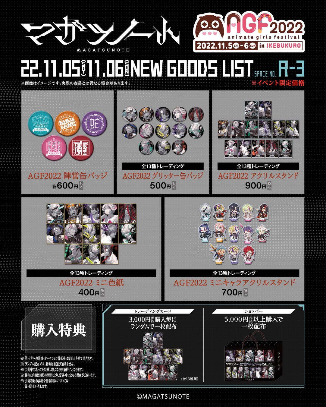 カズキヨネによる新規描き下ろしイラストを使用した13キャラクターのアクリルスタンド・缶バッジ・ミニ色紙をはじめ、マガツノート初となるミニキャライラストを使用したアクリルスタンドや陣営ロゴデザインの缶バッジも販売されます。