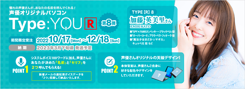 ![声優オリジナルパソコンのリバイバルシリーズに加藤英美里さんが登場!【Type:YOU[R] -タイプユーアール-】第8弾は10月17日よりスマッシュコアで受注開始!](https://entamerush.jp/wp-content/uploads/2022/10/2022-10-17_12-37-36_374020.jpeg)