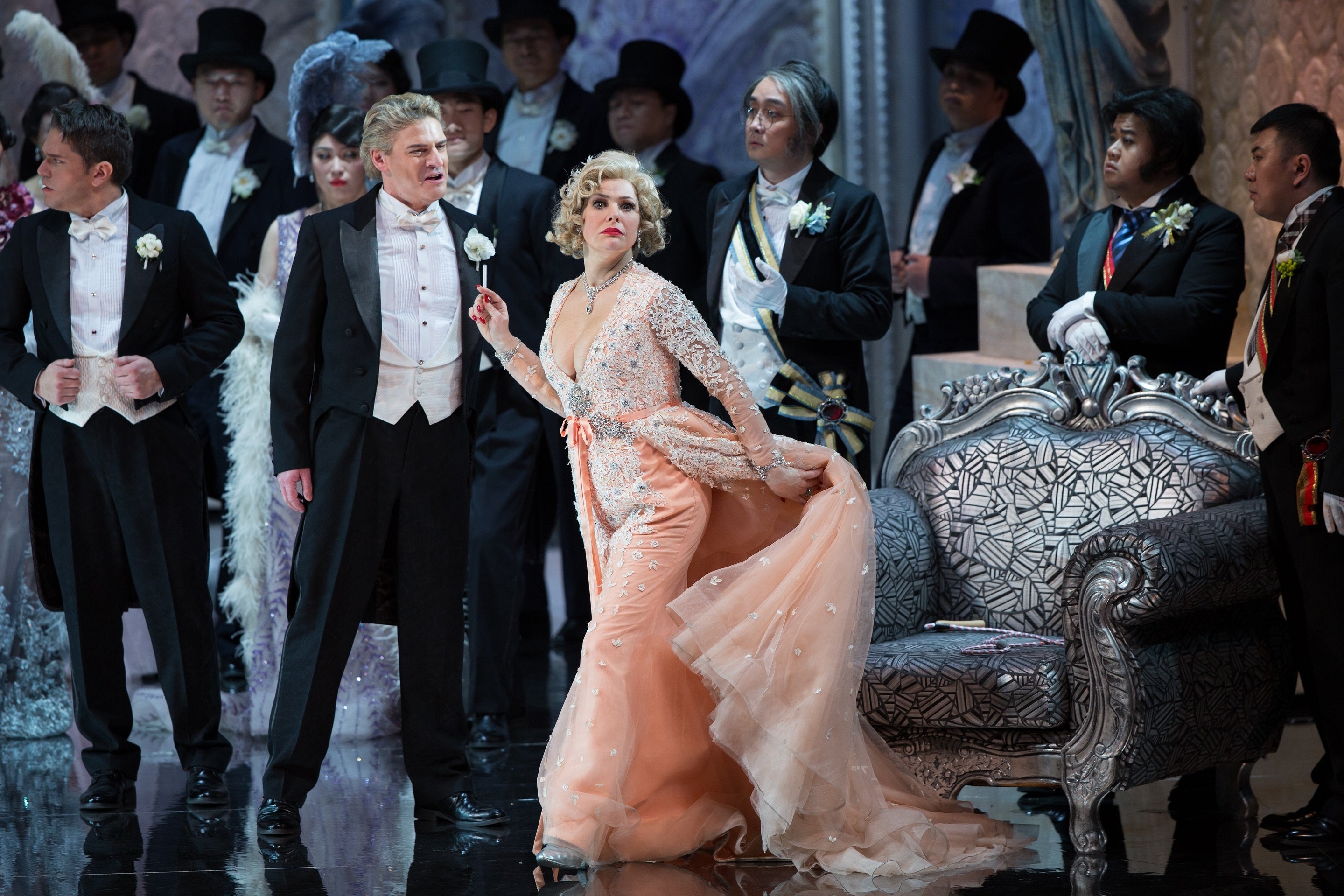 『メリー・ウィドウ』は、フランツ・レハール作曲によるウィーン・オペレッタの金字塔。美しい序曲やワルツ、アリア、二重唱などが散りばめられており、フレンチ・カンカンなどの見どころも満載で耳にも目にも楽しい極上のラブコメディです。演出・美術・衣裳を手掛けたウーゴ・デ・アナは、ロマンティックなパリの街並みを舞台上に表現。アナ自筆のカラフルなテキストやエッフェル塔などが用いられた華やかな舞台装置と衣裳が話題になりました。また、中国語の対話を取り入れることでコメディの要素を強調し、観客を大いに沸かせました。ハンナ役にはイタリアを中心に躍進しているエレーナ・ロッシ、ダニロに役はオーストリアの名バリトンのポール・アルミン・エーデルマンが登場。優れた洞察力と音楽への理解で定評のある指揮のトーマス・レスナーがオーケストラを率いて美しいワルツを奏でました。
