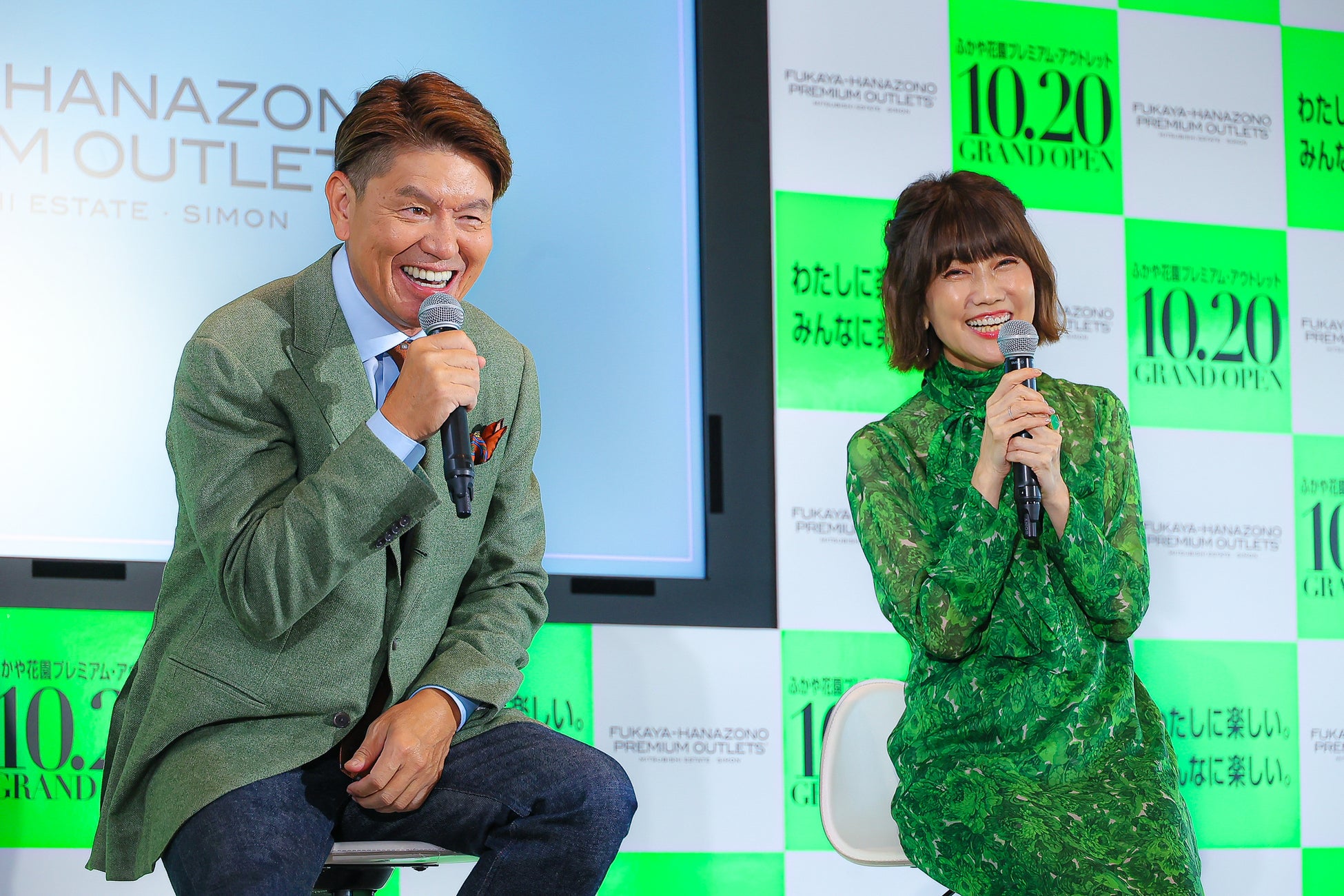開業に先駆け、タレントのヒロミ・松本伊代夫妻が愛犬タロウ君とともに登場し、「ふかや花園プレミアム・アウトレット開業記念イベント」に同施設のキーカラーでもあるグリーンをテーマに夫婦リンクコーデで会場に華を添えました。またふかや花園プレミアム・アウトレットのアンバサダーを務めるヒロミさんと深谷ゆかりの皆さんで作り 上げたCMを披露しました。