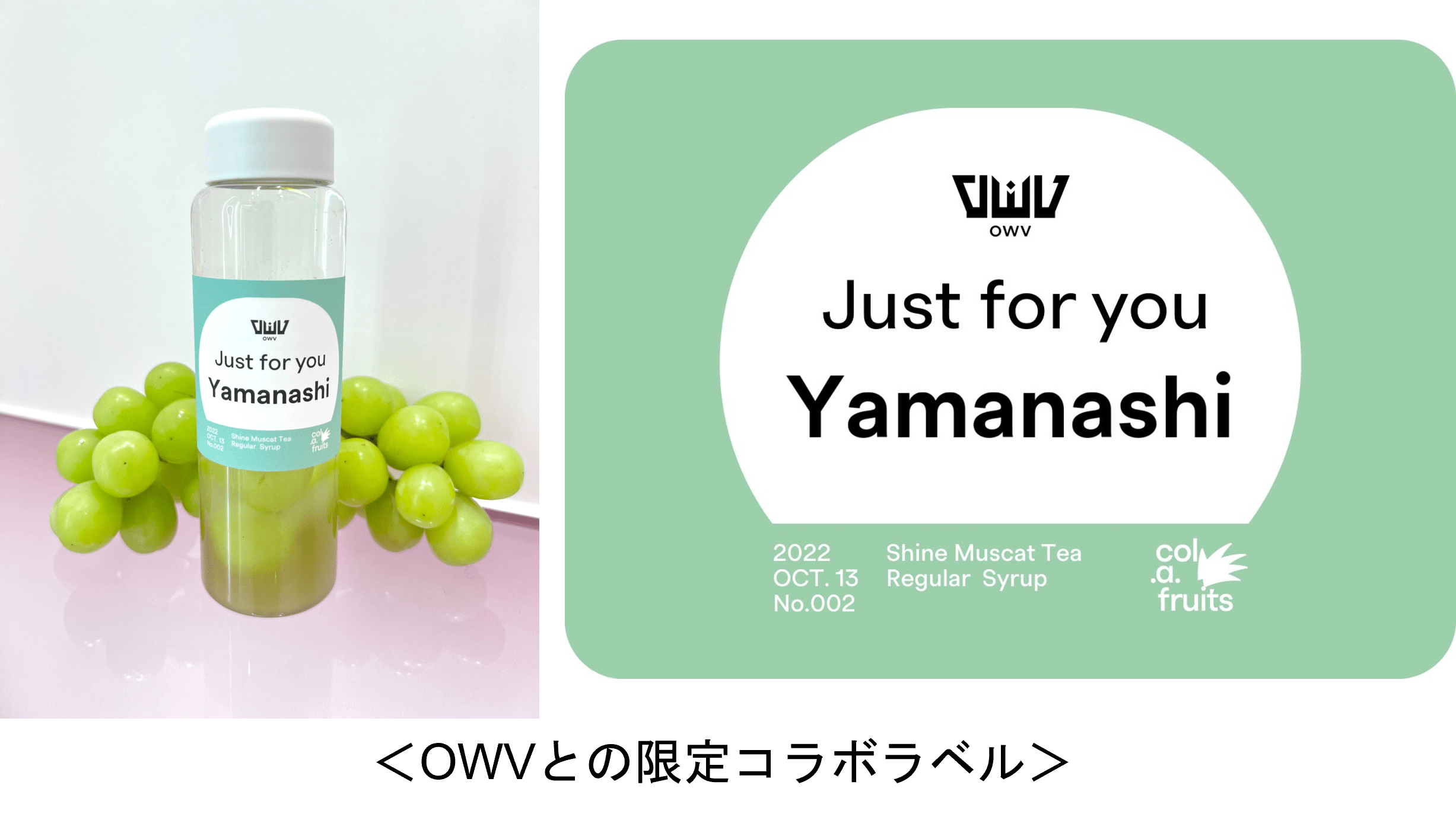 メインエリアで展開する、スマートフォンからドリンクのフルーツ・ベース・味・ボトルデザインを⾃由にカスタマイズすることができるパーソナライズドリンクブランドcol.a.fruitsカラフル)のブースでは、当日限定メニューとして⼭梨県産のシャインマスカットを使⽤した限定フレーバーの無料提供に加え、TGC フェス ⼭梨 2022に出演する⼤⼈気アーティストOWVとのコラボラベルが登場!推し活アイテムの新常識ともいえるパーソナライズドリンクとOWVとのコラボレーションはこの⽇限り!お⾒逃しなく!