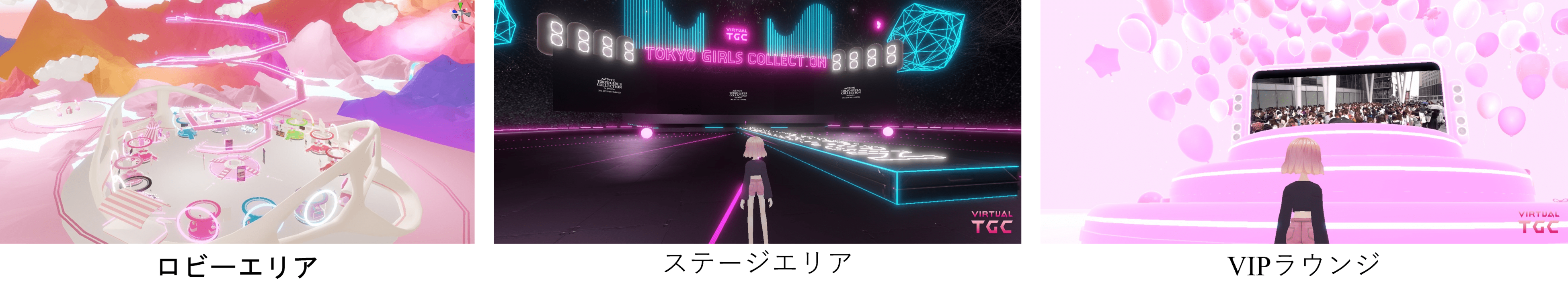 バーチャルTGCは、これまでリアル会場でお届けしていたファッションショーやアーティストライブの熱狂、話題のアイテムがタッチアンドトライできるブースなど、バーチャル空間ならではのアトラクションやスペシャルイベントなど、様々なコンテンツが追加された “リアルより楽しいかもしれない“スマートフォン向けメタバースアプリです。空間内はブースやSNS映えスポット、アトラクションなど様々な体験コンテンツが設置されたロビーエリア、巨大スクリーンが設置され、リアル会場のカメラからの映像で、臨場感の高いスペシャルパブリックビューイング(生配信)が実施されるステージエリア、そして、空間内に隠された5つの鍵を集めると入室が可能になるプレミアムなVIPラウンジの、3つのエリアに分かれています。TGCがお届けするファッション・メタバースな空間にご期待ください!