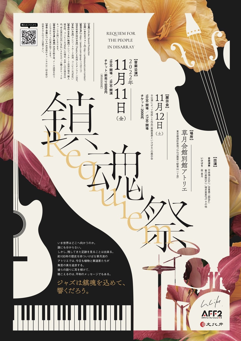 ​2020年世田谷区芸術アワードを受賞した音楽公演が、普段一般公開されていない草月会館別館アトリエにて開催されます。「混沌とする世界の犠牲になった人々へ花を手向ける」という想いのもと、花で埋め尽くされた会場で音楽を奏でます。公演翌日には、パフォーマンスによって完成した音楽といけばなの融合作品が同会場にて展示されます。ほかでは観ることが出来ない貴重かつ圧倒的なイベントを、ぜひご覧ください。