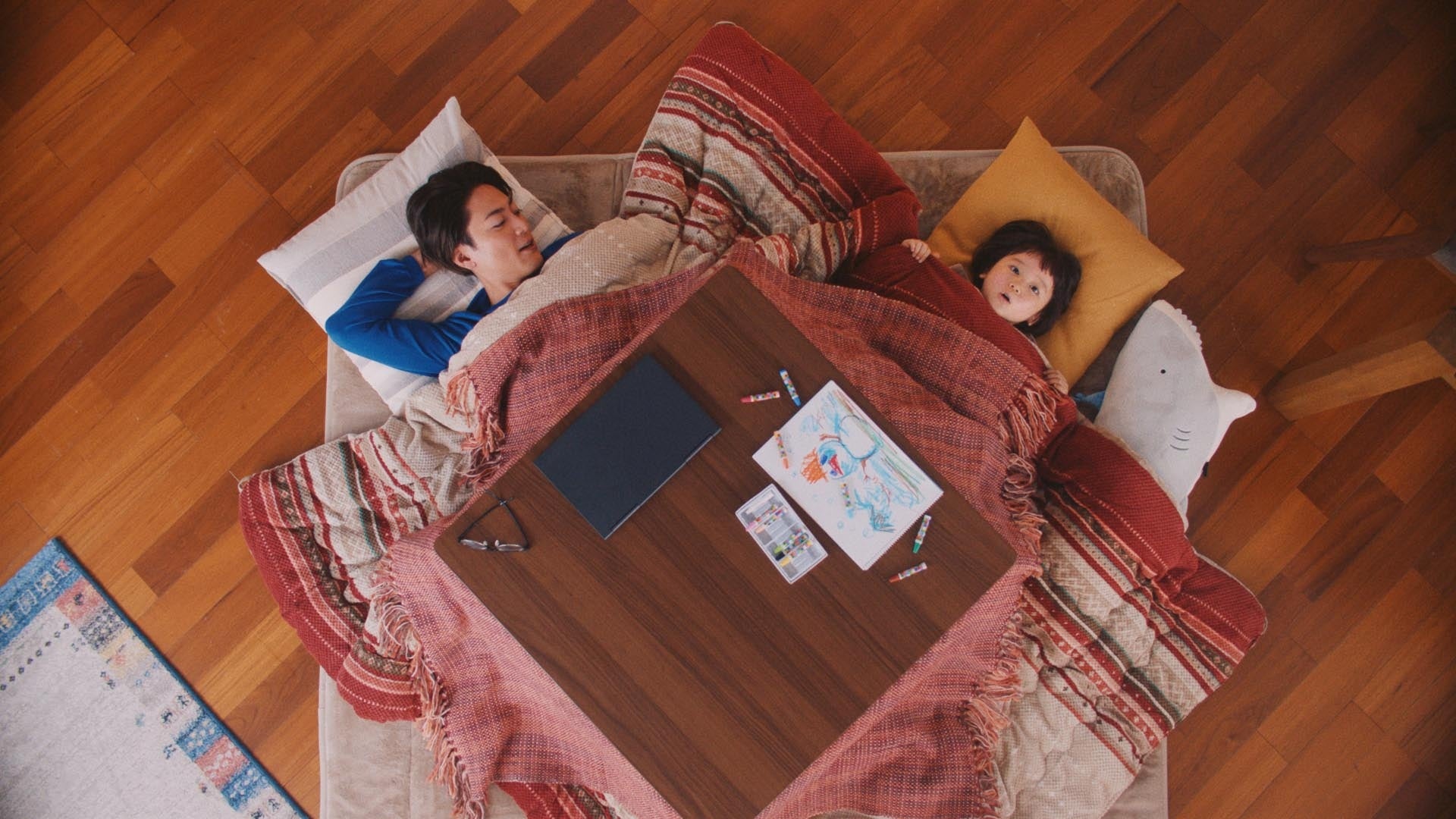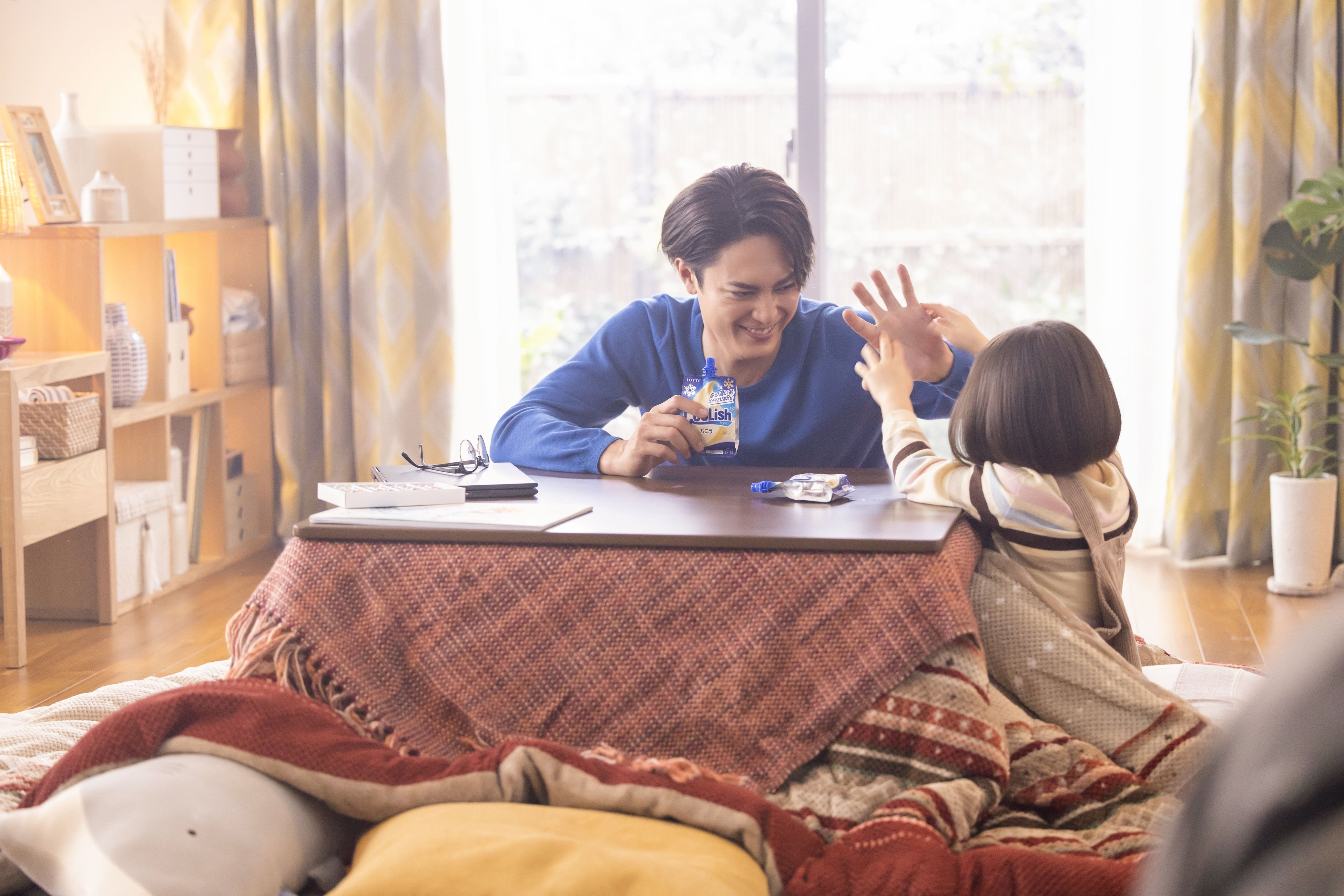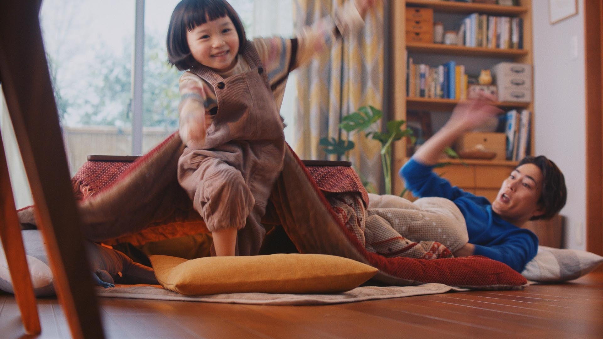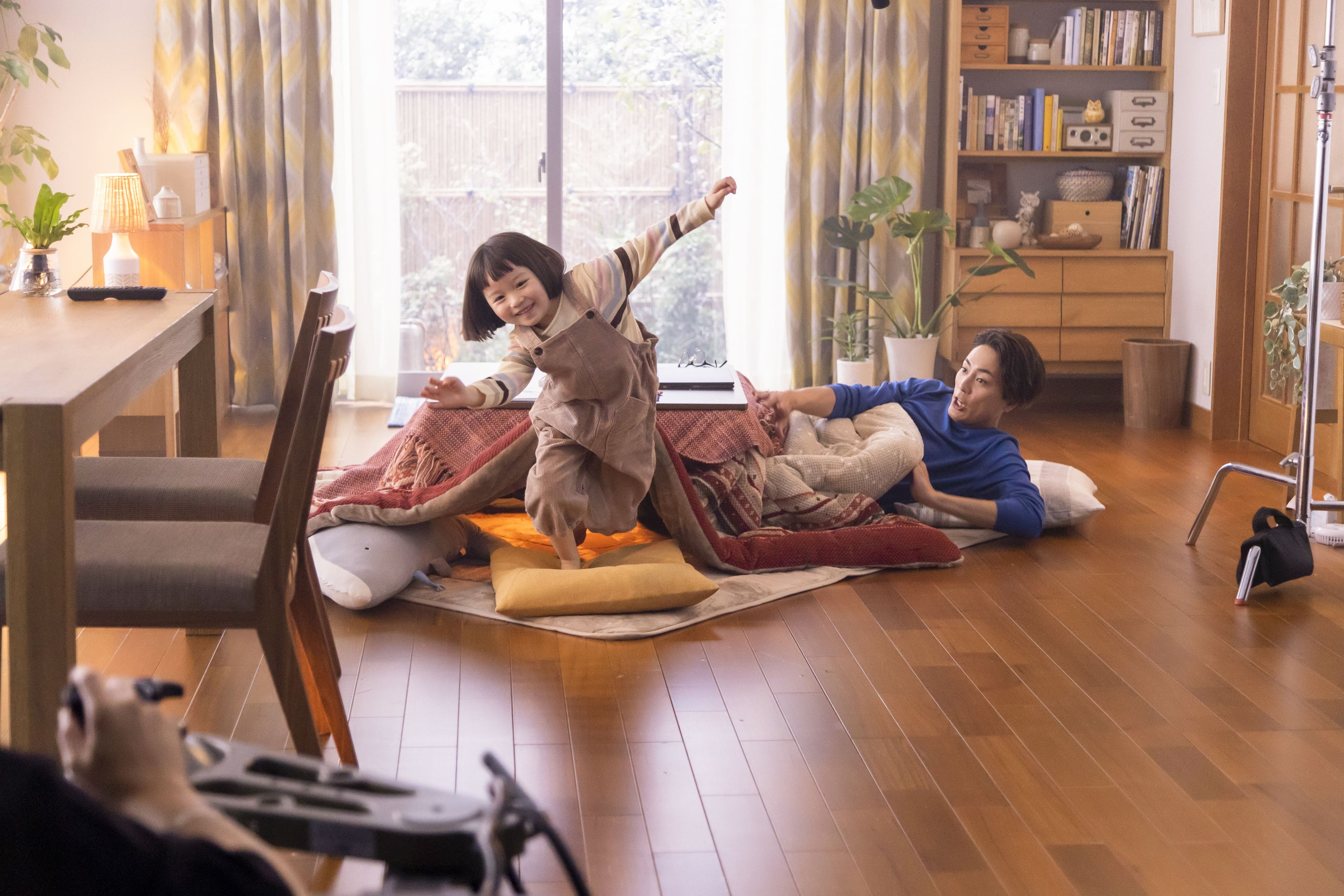 また共演が3回目となる今回の撮影。小学生になったななちゃんの成長ぶりに驚く間宮さんでしたが、撮影の途中で一緒に遊んだり、あやとりを楽しむ二人の姿は今までと変わらず。少し年の差がある兄妹のような仲の良さが垣間見られました。こたつでの撮影を楽しむ、“しょうたろうさんとななちゃん”によるメイキング映像にもぜひご注目ください。
