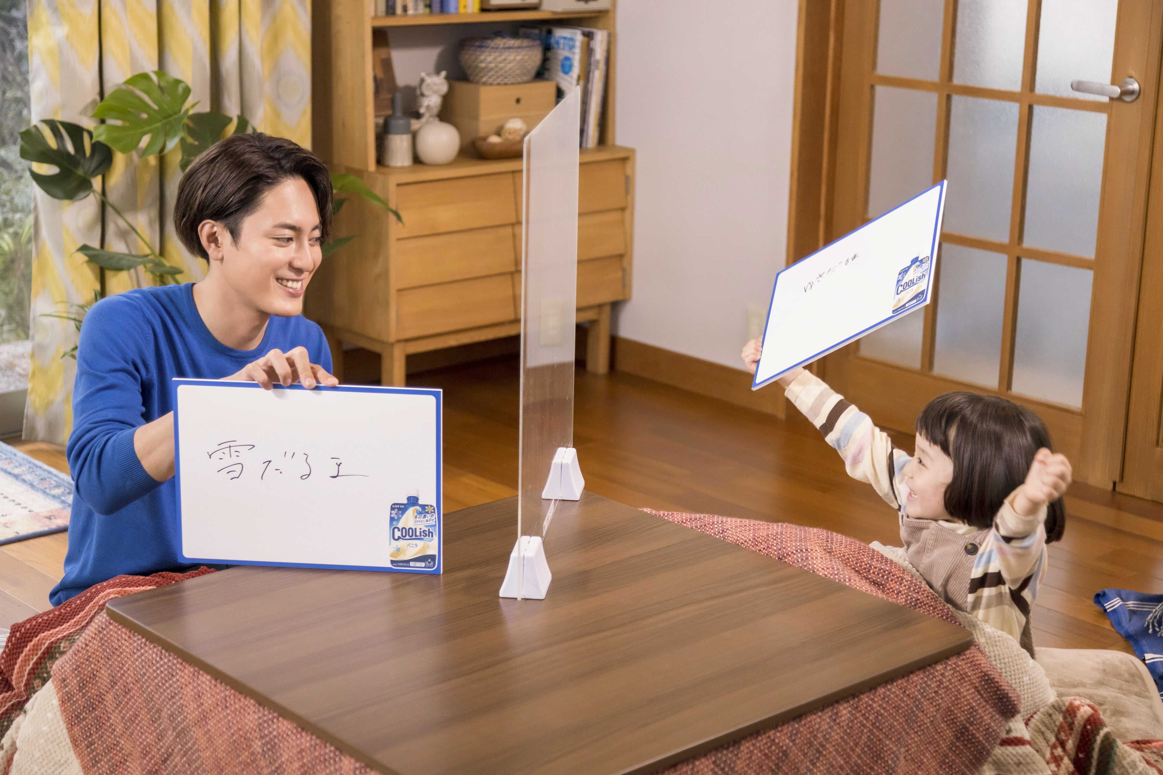 冬を舞台にした新TVCMは、外では雪が舞うなか、間宮さんとななちゃんが家のこたつに入り体が火照るまでじっと待つ姿から始まります。「今です!」とななちゃんの合図があり、冷蔵庫まで走り出す二人。その後、「クーリッシュ バニラ<冬の濃いめ>」を美味しそうに飲み、「いきかえる~!」二人の姿が描かれています。