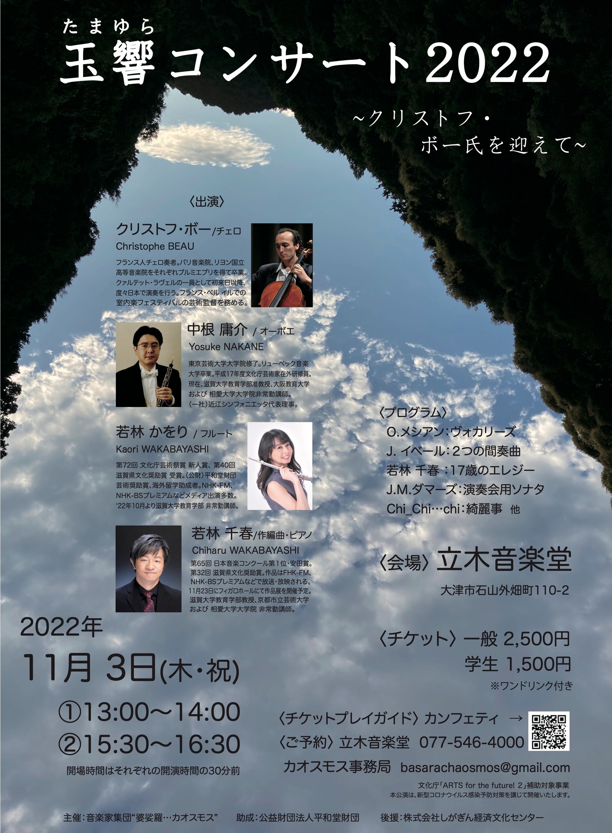 音楽家集団“婆娑羅…カオスモス”が主催する『玉響コンサート2022』、今年はフランスより、チェリスト クリストフ・ボー氏を迎えて、2022年11月3日(木・祝)に開催されます。会場の立木音楽堂(滋賀県大津市石山外畑町110-2)のステージは、背面部分が一面ガラス張りになっており、演奏を聴きながら琵琶湖から流れでる瀬田川の景観を一望できる贅沢空間。