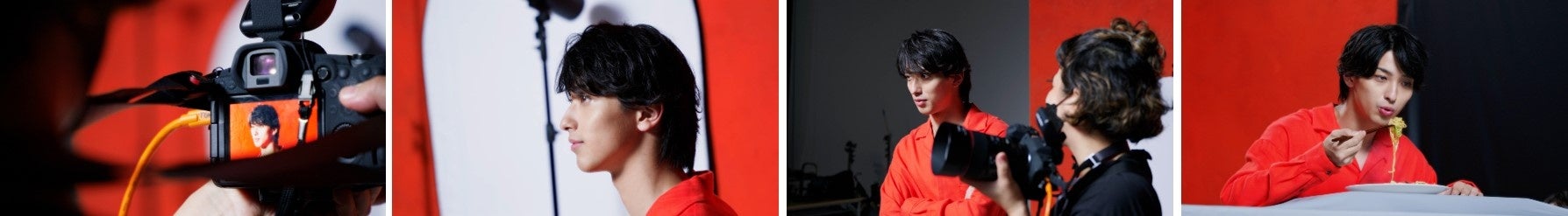 丹色の背景、丹色の衣装に身を包んだ横浜流星さん。「五目あんかけ焼そば」が「たっぷり具材のあんが掛かった焼そば」だと説明を聞いた後、料理が出てくるのを想像と期待を膨らませながら待ちます。
