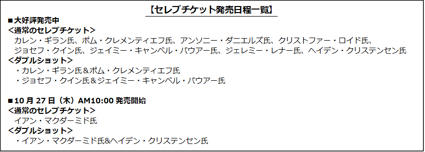 さらに、先日来日が発表されたヘイデン氏とのダブルショットで撮影ができる、ファン必見のセレブチケットも発売!