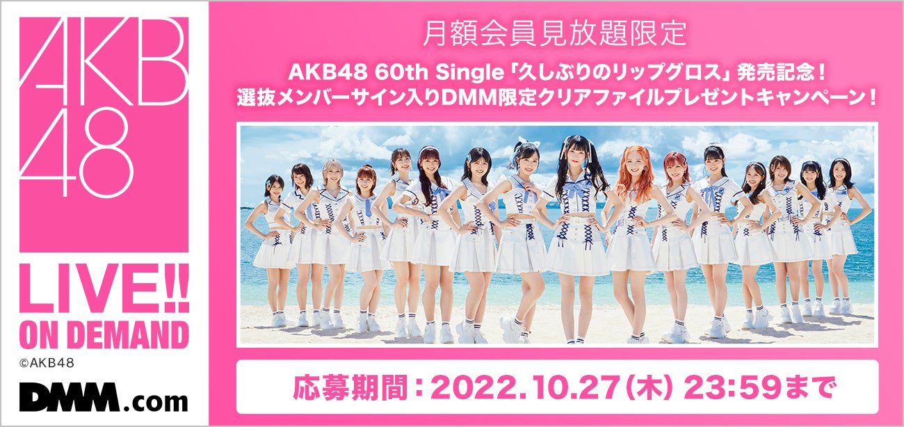 合同会社DMM.com(本社:東京都港区、会長 兼 CEO:亀山敬司 以下「DMM」)は、AKB48 60th Single「久しぶりのリップグロス」発売を記念し、10月19日(水)~10月27日(木)まで、プレゼントキャンペーンを実施します。AKB48 LIVE!! ON DEMAND月額見放題会員の方限定で、 抽選で16名様に選抜メンバーサイン入りDMM限定クリアファイルをプレゼントいたします。月額見放題サービスに入会していただき是非ご応募ください。