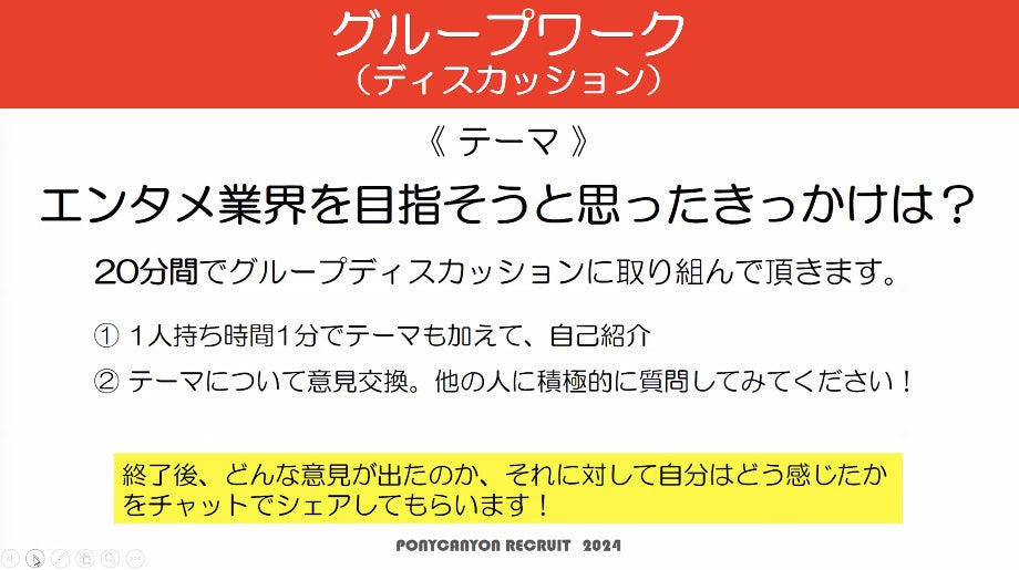 今回、200名を超える就活生がオンラインにて参加。始めに人事担当者から「ポニーキャニオンを知ってもらうことと、自分に合った会社に入るためにはどうしたらいいか考えてもらうきっかけにしてください」と話しがあり、会社概要、若手社員の就活体験記、オンライングループワーク体験、質問会が行われるとのこと。
