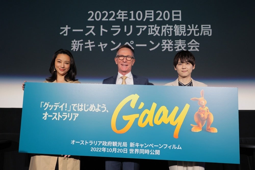 オーストラリア政府観光局は、オーストラリアの魅力を再発見するグローバル新キャンペーン 「 『グッデイ!』 ではじめよう、オーストラリア」を日本時間10月20日(木)より開始いたしました。本キャンペーン開始を記念して制作されたショートムービー「G’day」(グッデイ)も同日に世界同時公開され、日本ではプレミア試写会を開催。ムービーに登場するカンガルーのアニメキャラクター「ルビー」とユニコーンの「ルイ」のお披露目を行いました。日本語版の吹き替えでキャラクターの声を務めた、俳優・モデルの高橋メアリージュンさんと、声優の梶裕貴さんも舞台挨拶に訪れ、スペシャルトークショーにてオーストラリアについて語っていただきました。
