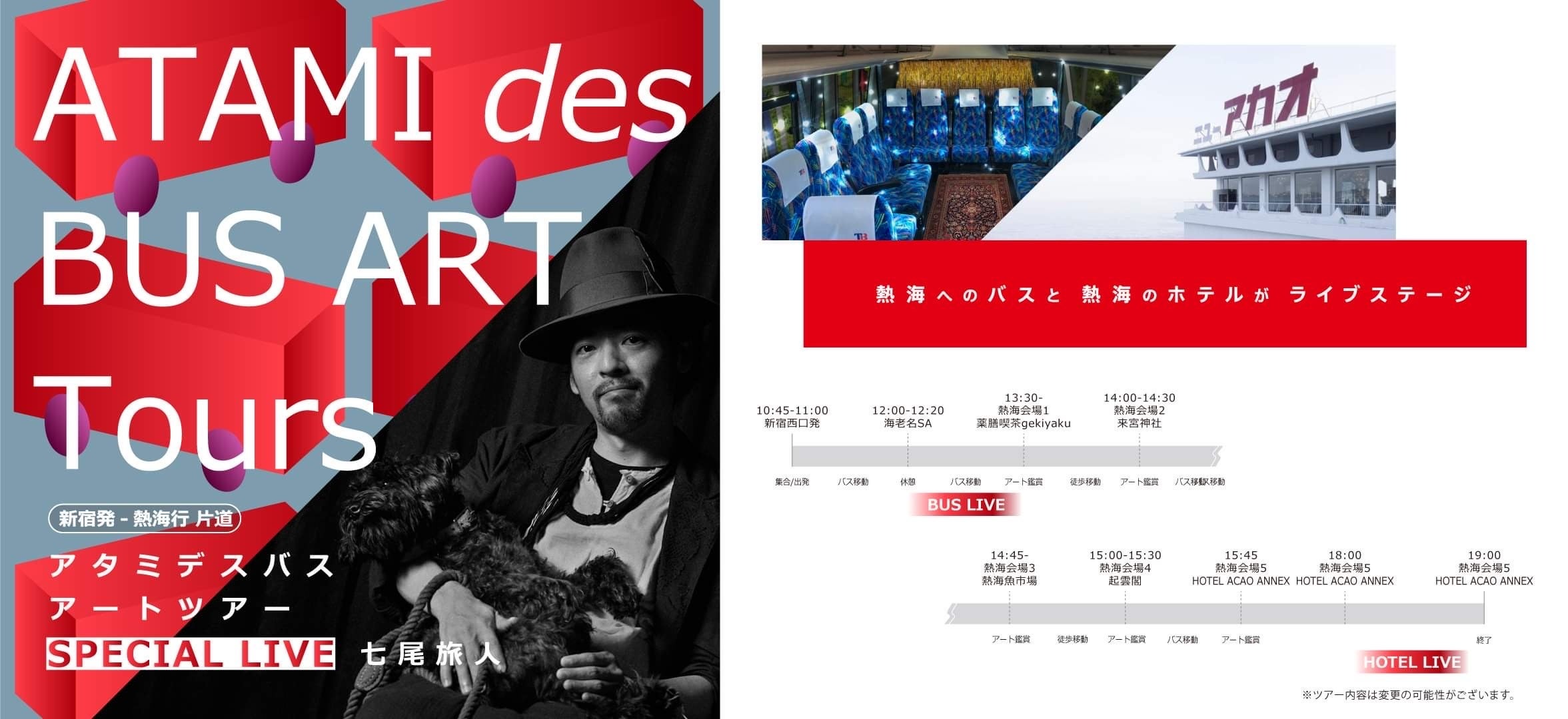 また、オフィシャルバスツアーの「ATAMI des BUS ART Tours/アタミデスバスアートツアー」に、スペシャルな1日が決定しました!!ゲストに七尾旅人を迎え車内でも、限定30名のお客様との交流をおこなうほか、HOTEL ACAOに到着した際は、LIVEも予定しております。もちろん、個性豊かな作品の魅力と熱海の見どころやオススメのスポットもガイド付きでご案内いたします。熱海市内の会場4箇所(薬膳喫茶gekiyaku / 来宮神社 / 熱海魚市場 / 起雲閣を予定)を巡りながら、同じく会場となるHOTEL ACAOを目指します。