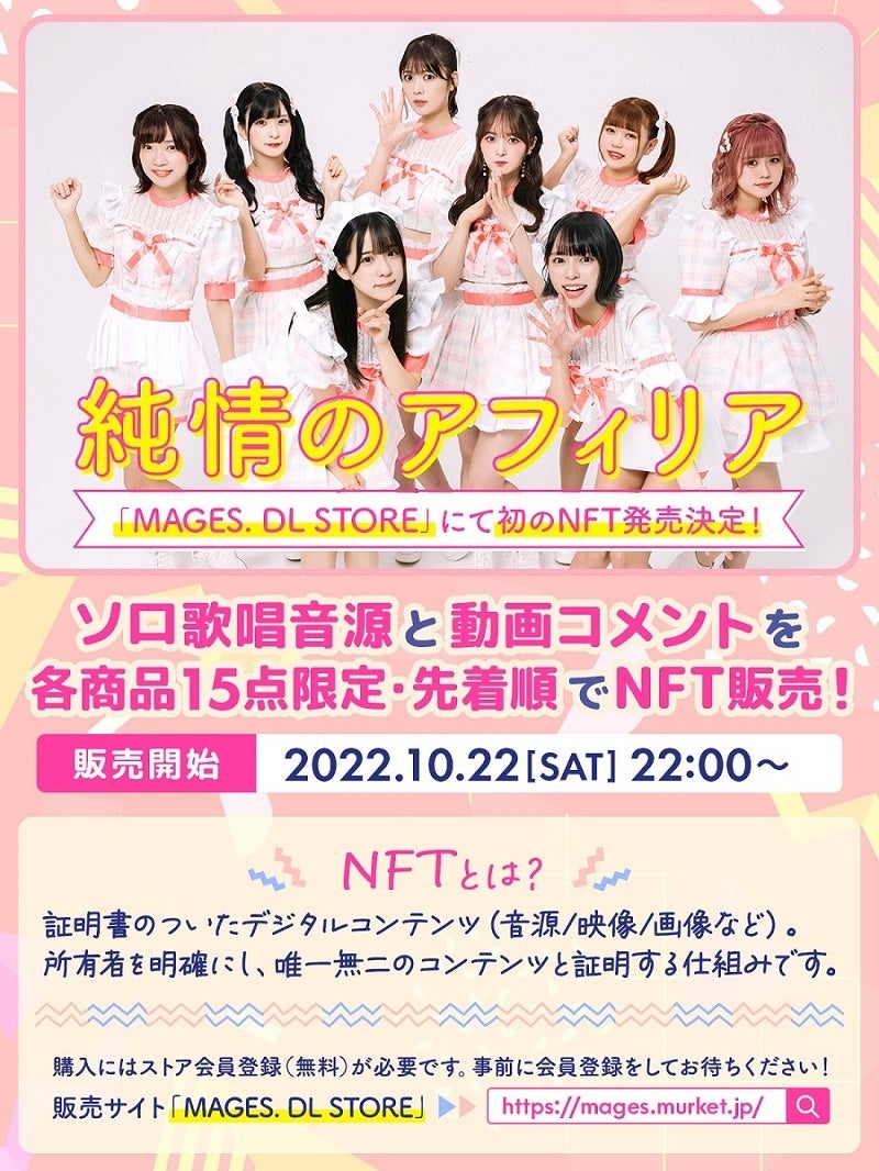 本NFTは、「純情のアフィリア」メンバー8名(渚カオリ、葉山カナ、寺坂ユミ、雨森セラ、桜田アンナ、優希クロエ、東城アミナ、夏目ベール)それぞれのソロNFT。10月25日(火)リリースの、2年半ぶりとなるシングル「LIMITLESS」収録の「LIMITLESS」「うそつき」「Go My Love」を、NFT限定で、各メンバーの、メンバーfeat.音源と自撮り動画コメントがセットになったNFTで計24アイテム、それぞれ先着15点限定の、ここでしか手に入らない内容となっています。