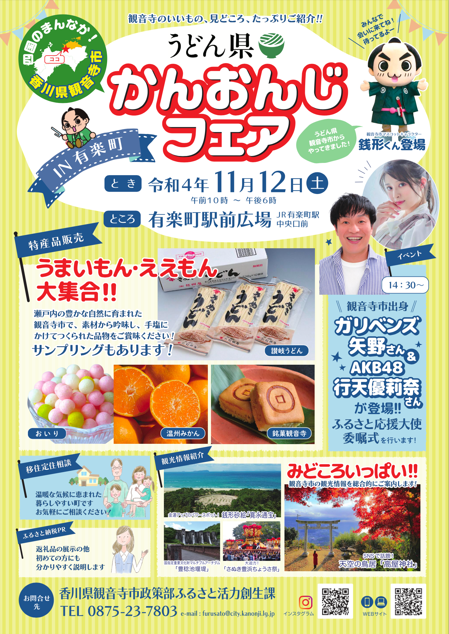 株式会社DRELLAは、AKB48の行天優莉奈が出身地である香川県観音寺市の「ふるさと応援大使」に就任すること、11月12日(土)に有楽町駅前広場にて開催される「四国のまんなか!まるごと!かんおんじフェア」の委嘱式に出席することを発表。※ふるさと応援大使の委嘱日は2022年11月12日のフェア当日。