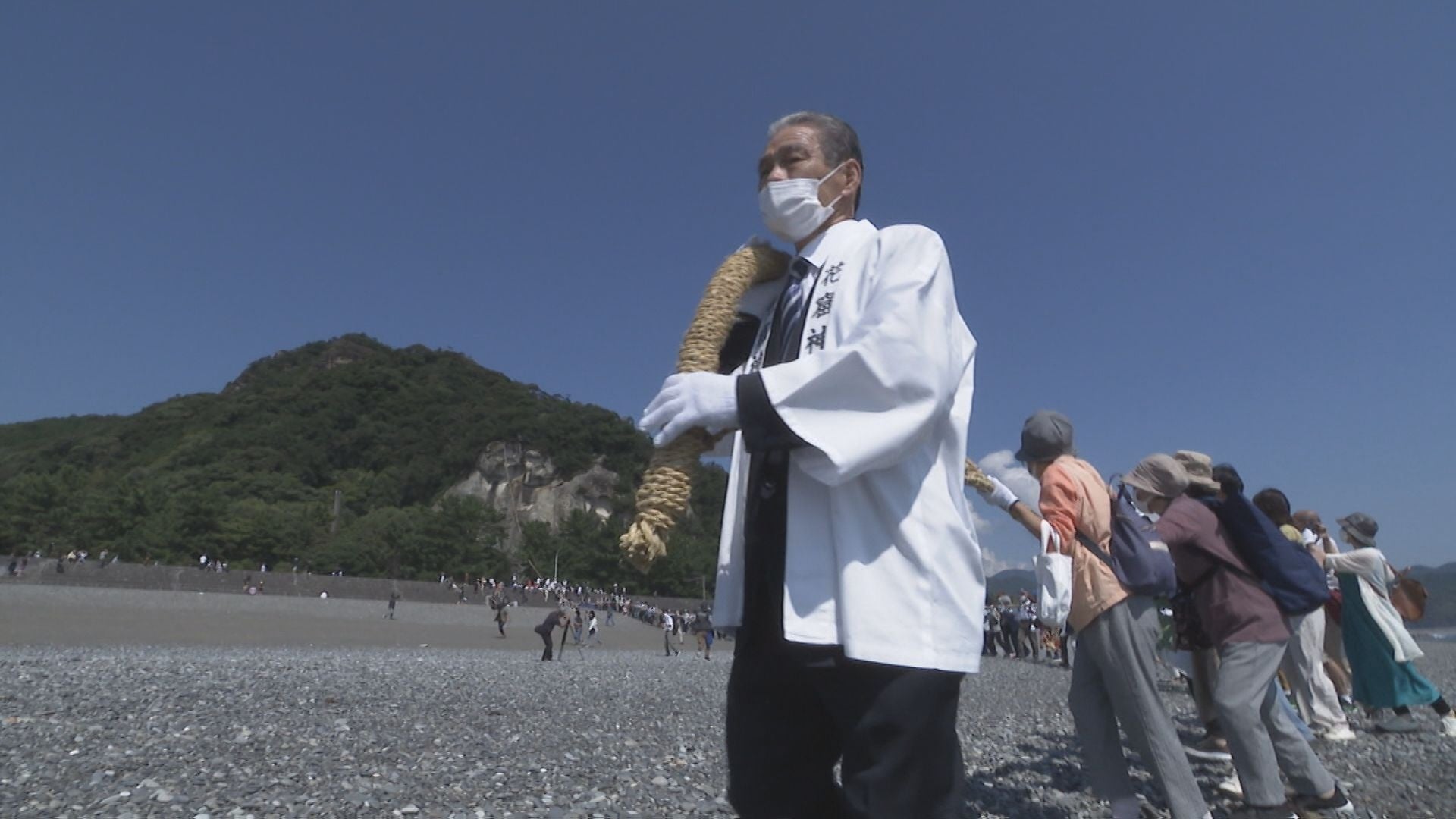 10月2日、コロナ禍の影響で3年ぶりとなった神事が行われた。人々は感染対策の軍手をはめた手で綱をしっかりと持ち、美しく波を打つ海岸、七里御浜へと歩み始めた。