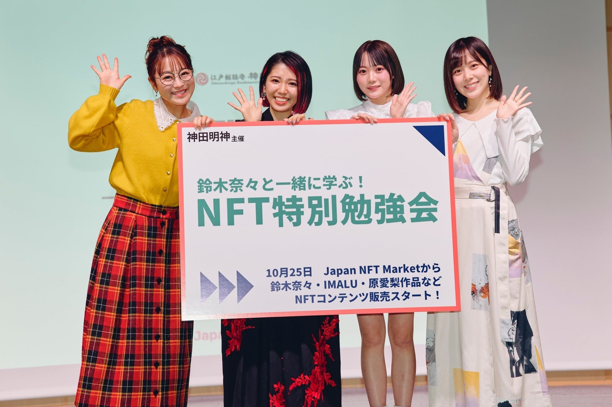 この度、鈴木奈々・元ラストアイドルメンバー 橋本桃呼/間島和奏・書道家の原愛梨作品など、弊社ツインプラネット所属タレントのコンテンツを、『Japan NFT Market』(代表取締役:佐山聖斗)にてNFTとして販売を開始するにあたり、販売が開始される初日の10月25日(火)、上記メンバーと共にNFT特別勉強会を東京都千代田区にある神田明神内イベント会場にて開催いたしました。