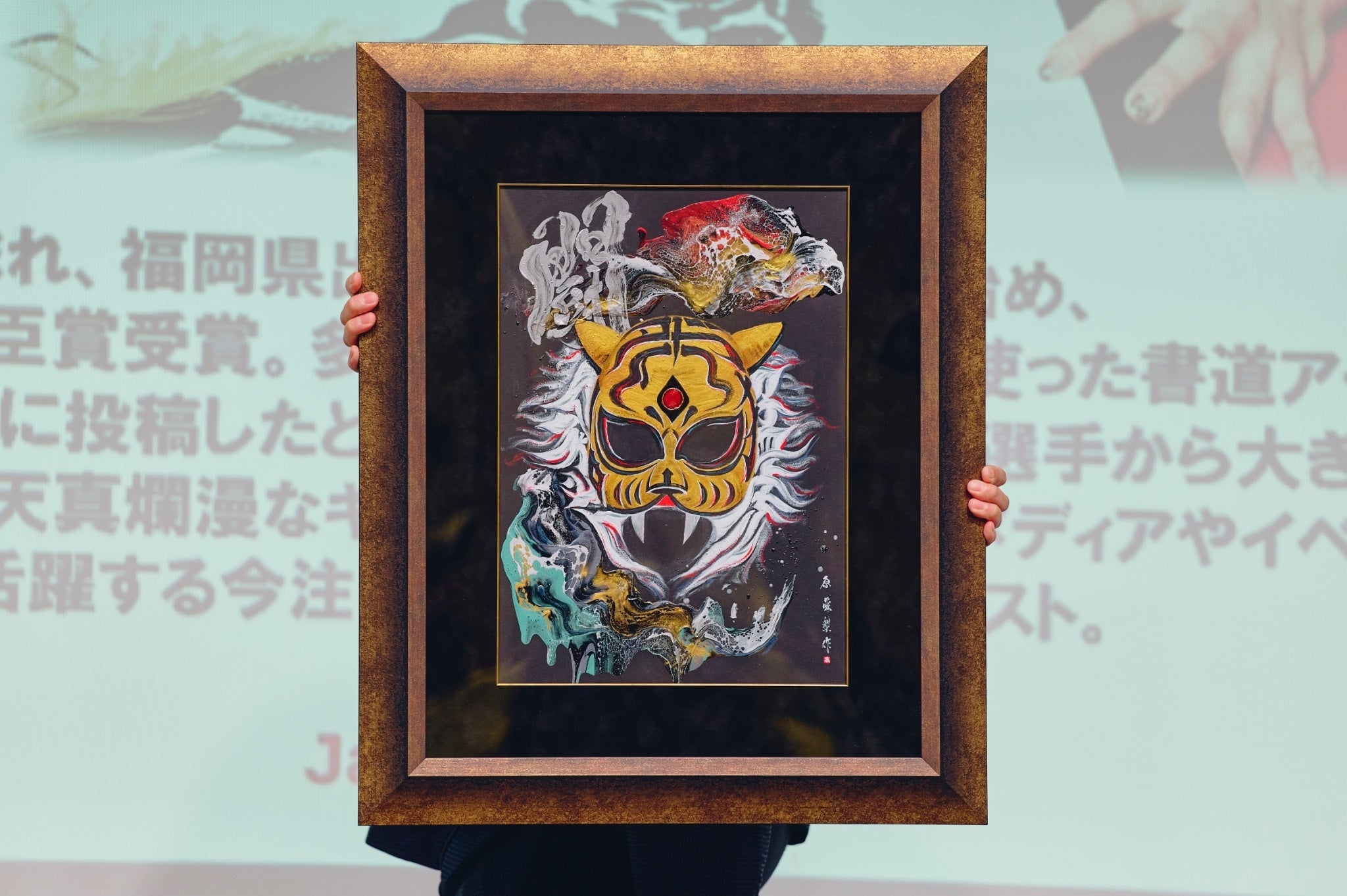 ステージ上で、本物のタイガーマスクを手に持つ佐山サトル氏の息子・佐山聖斗氏に、原愛梨から作品が受け渡されると会場は拍手に包まれました。