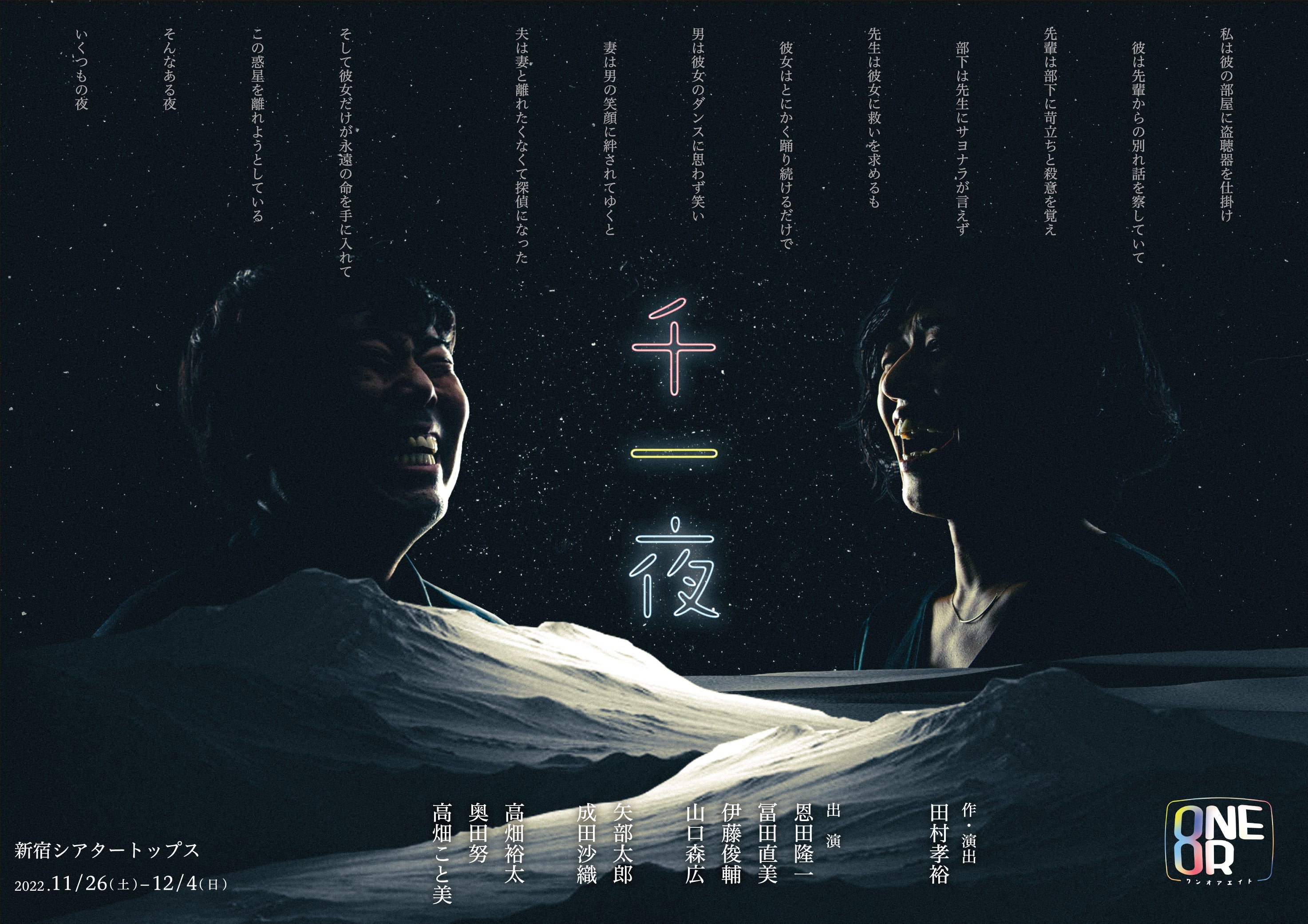 ONEOR8『千一夜』が2022年11月26日 (土) ~ 12月4日 (日)に新宿シアタートップス(東京都新宿区)にて上演されます。チケットはカンフェティ(運営:ロングランプランニング株式会社、東京都新宿区、代表取締役:榑松 大剛)にて10月30日(日)10:00より発売開始です。