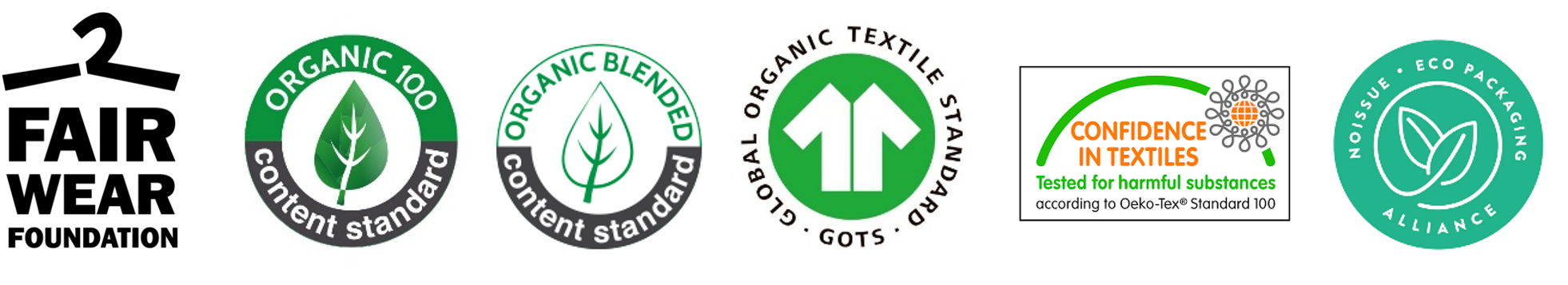 全てのTシャツとセーターにFair Wearラベルが付いており、オーガニックテキスタイル世界基準(GOTS)、 OCSオーガニック認証、OEKO-TEX(エコテックス)も取得しています。エコパッケージングアライアンスにも参加し、堆肥化できる包装を使用しています。