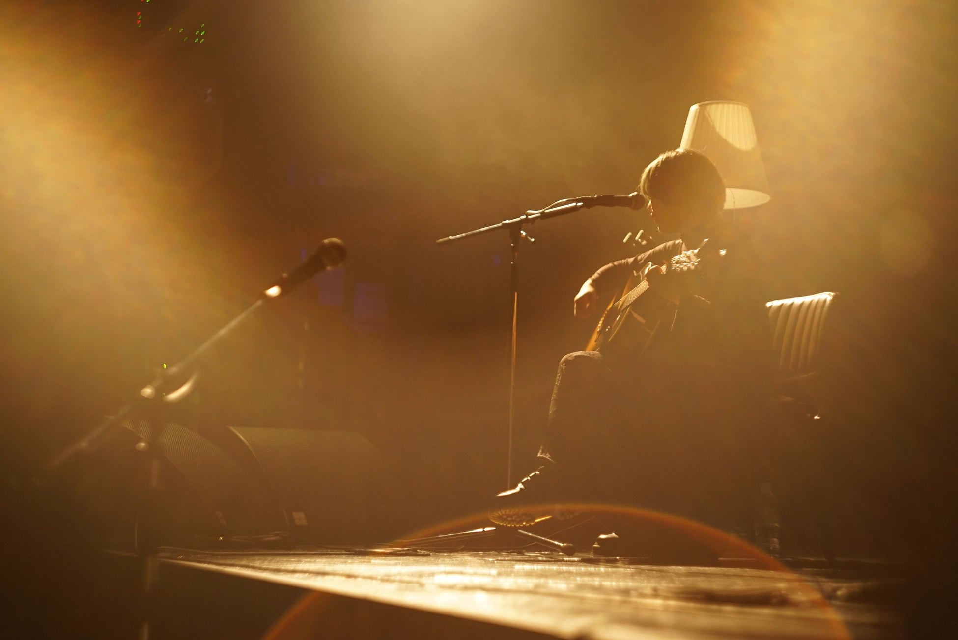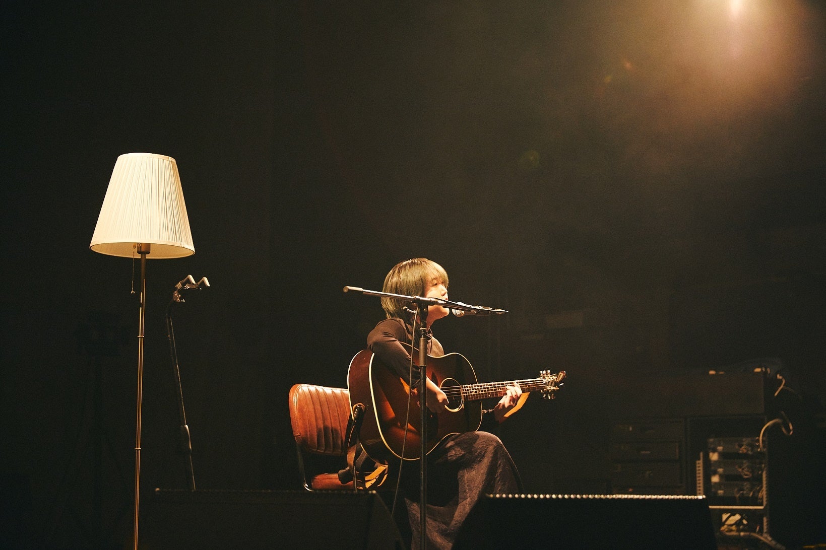 映像が終わったところで、暗闇の中に本人が登場。自ら明かりを点け、ギターを抱えてステージ端に直接座ると、戯れるようにギターをつま弾きハミングしながら、未発表曲「また会えるの?」へ。そこから、やはり未発表曲で公演タイトルとなった4曲目「気に入ってくれたらいいな」までは、いわゆるMCの語りと、作風であるトーキングやポエトリー・リーディング、歌メロがナチュラルに繋がり、ドラマティックな物語を綴った組曲のようだった。