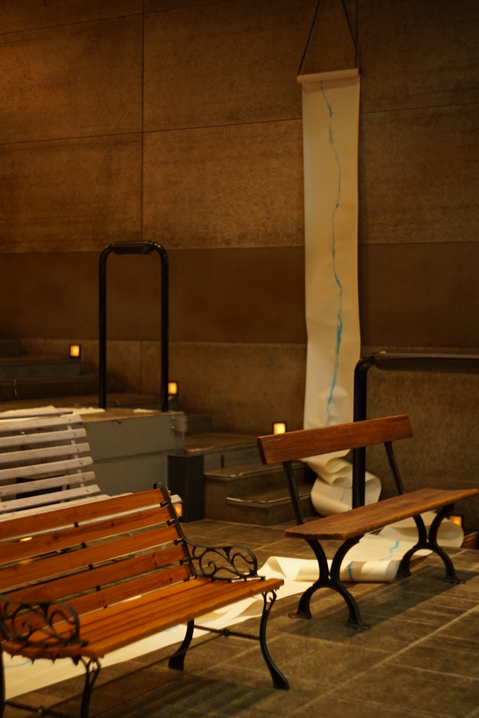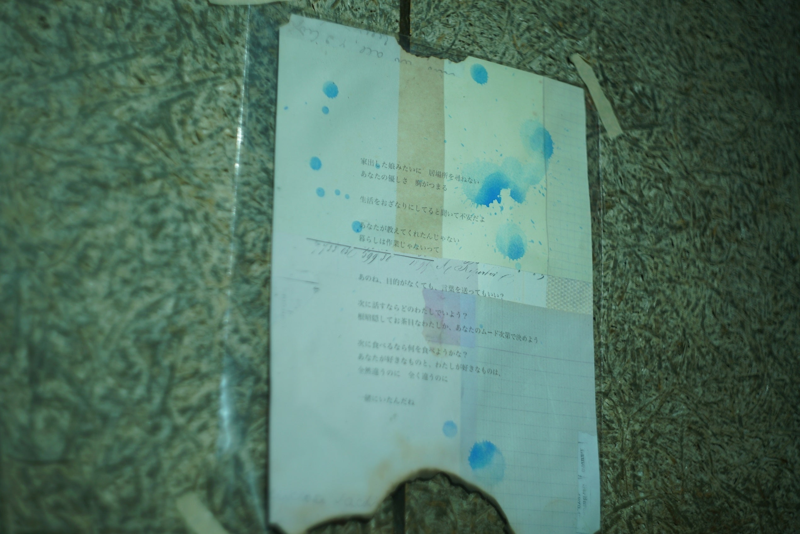 自作の詩が展示され、フロア前方には、白地に一筆書きのような青いラインを引いた長い帯と、木製のベンチ。ステージには、白いスタンド型ライトに、小さな黒いチェアーと木製の丸椅子。そんなインスタレーション・アートさながらの空間で、ライヴが幕開けした。が、ステージは無人で、スクリーンに映像と詩が断片的に映され、そこに本人の朗読が重ねられていく。無機質な階段、池の水鳥、汗をかいたグラス、スクランブル交差点……。「毎日は、うすらぼんやり」「私がいなくなる時、あなたはどんなふうになるんだろう」「もういらない」「このやり方しか知らない」……。