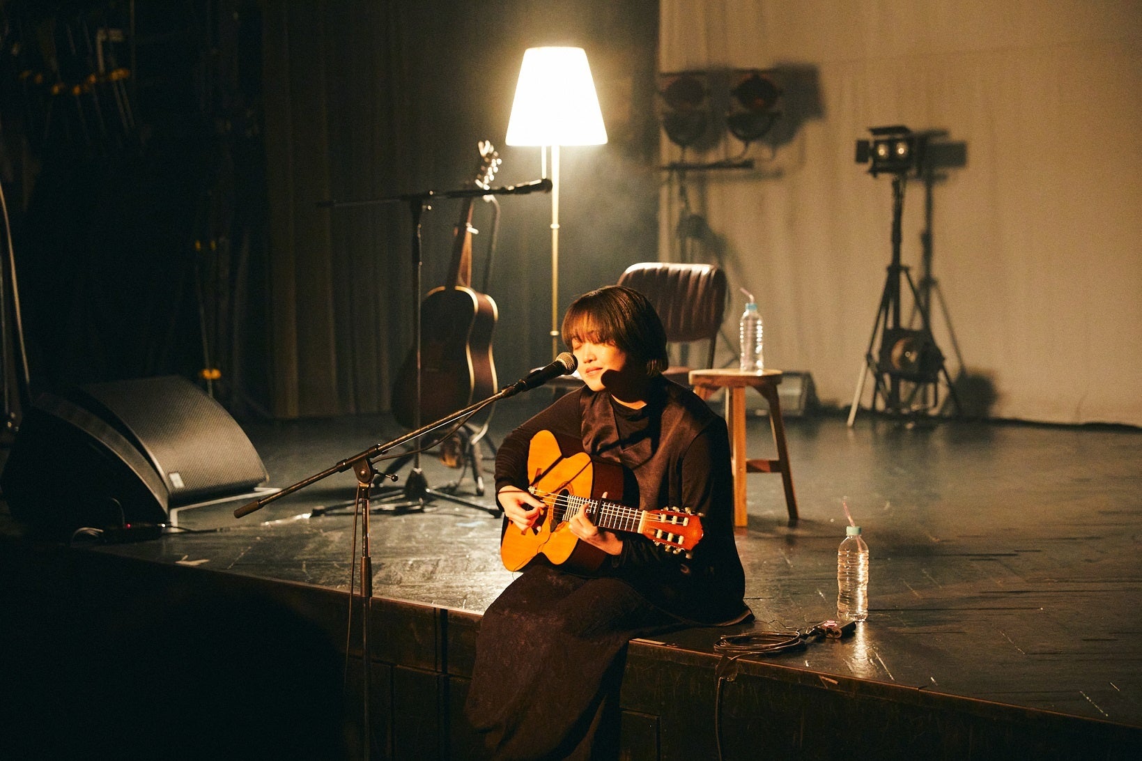 映像が終わったところで、暗闇の中に本人が登場。自ら明かりを点け、ギターを抱えてステージ端に直接座ると、戯れるようにギターをつま弾きハミングしながら、未発表曲「また会えるの?」へ。そこから、やはり未発表曲で公演タイトルとなった4曲目「気に入ってくれたらいいな」までは、いわゆるMCの語りと、作風であるトーキングやポエトリー・リーディング、歌メロがナチュラルに繋がり、ドラマティックな物語を綴った組曲のようだった。