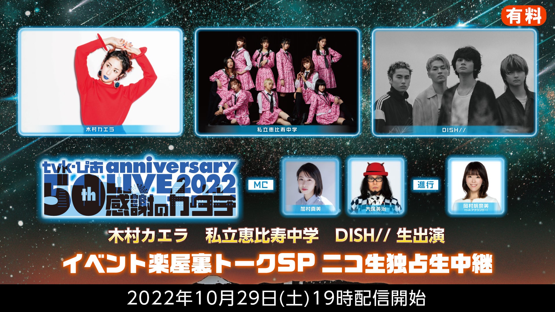 【木村カエラ、私立恵比寿中学、DISH// 生出演】「tvk・ぴあ 50th anniversary LIVE 2022~感謝のカタチ~」イベント楽屋裏トークSP ニコ生独占生中継(有料)