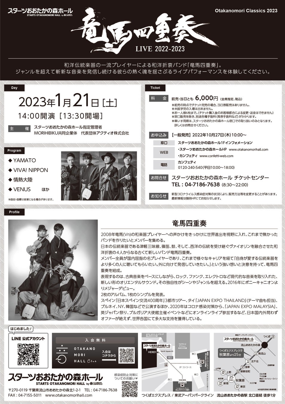 スターツおおたかの森ホール指定管理者MORIHIBIKU共同企業体 代表団体アクティオ株式会社主催、『竜馬四重奏 LIVE 2022-2023』が2023年1月21日 (土)にスターツおおたかの森ホール(千葉県流山市おおたかの森北1-2-1)にて開催されます。