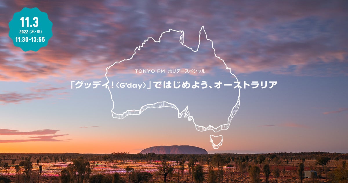 TOKYO FMでは、2022年11月3日(木・祝)11:30~13:55、TOKYO FMホリデースペシャル『「グッデイ!(G‘day)」ではじめよう、オーストラリア』をお届けします。豊かな自然や文化、おいしいグルメや人々のライフスタイル、アボリジナルアートなど、オーストラリアの素敵な情報を時間の限り紹介するスペシャルプログラムです。パーソナリティはLOVEがつとめ、ゲストにはオーストラリアにゆかりのある小島慶子、高橋メアリージュン、ヴォーン(Vaughan)を迎え、様々な側面からオーストラリアの魅力を深く掘り下げていきます。