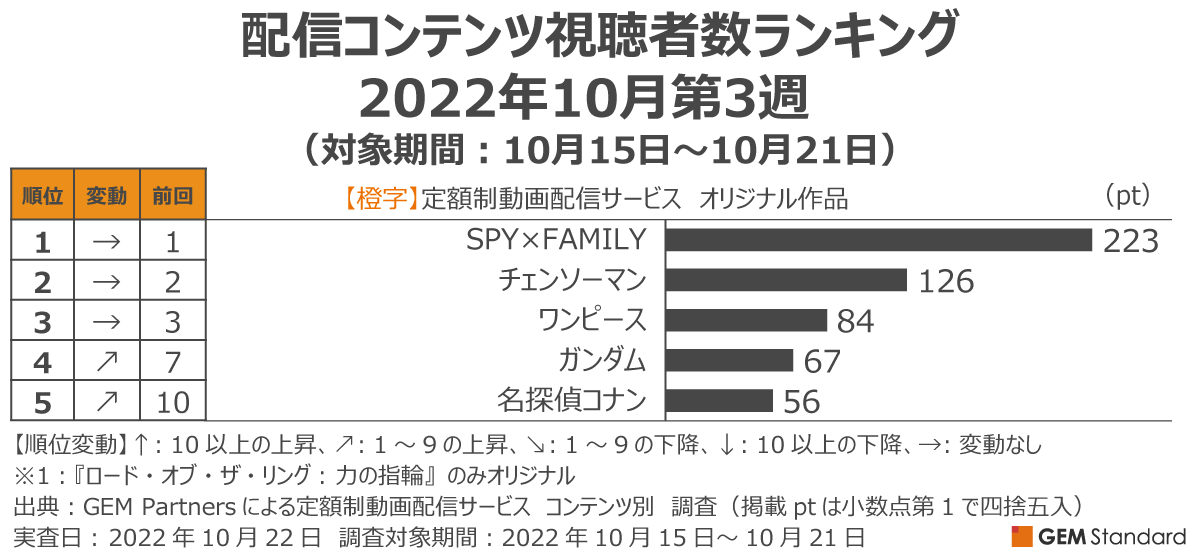 エンタテイメント業界に向けたデータ×デジタルマーケティングサービスを提供するGEM Partners株式会社(ジェムパートナーズ、所在地:東京都港区、代表取締役:梅津文)は10月27日(木)、複数の定額制動画配信サービスを横断して集計した2022年10月第3週の「配信サービス視聴者数ランキング(調査対象期間:10月15日~10月21日、調査対象:日本在住15~69歳男女)」を発表します。