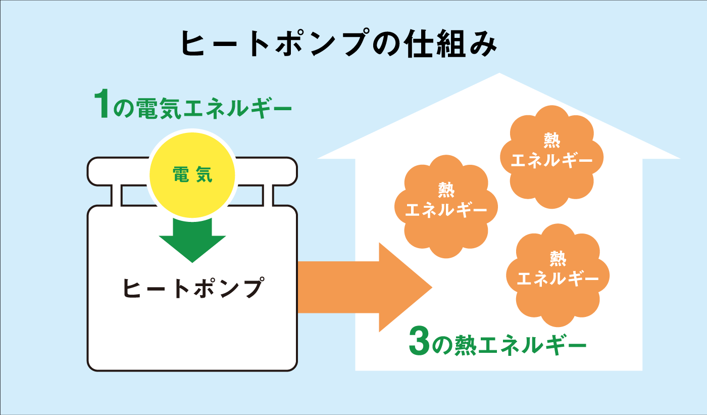 少ない電気で効率よくたくさんのエネルギーを生み出す「ヒートポンプ」を使っていることが、省エネのヒミツ。