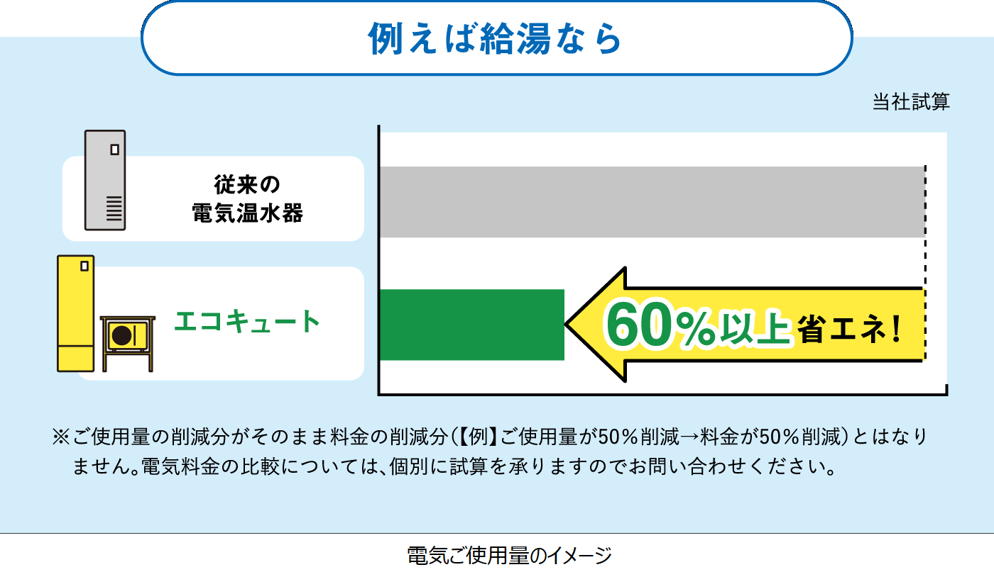 ヒートポンプシステムは、電気エネルギー「1」を消費して、空気中の熱エネルギーを「1以上」取り込み、「2以上」の熱エネルギーを生み出すため、電気のご使用量が1/2以下になる優れモノ。