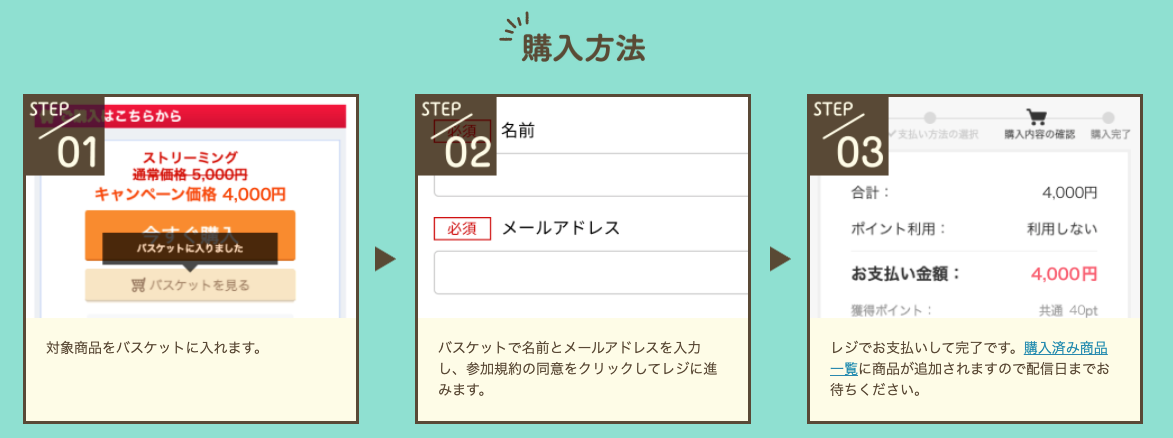 ②バスケットで名前とメールアドレスを入力し、参加規約の同意をクリックしてレジに進みます。