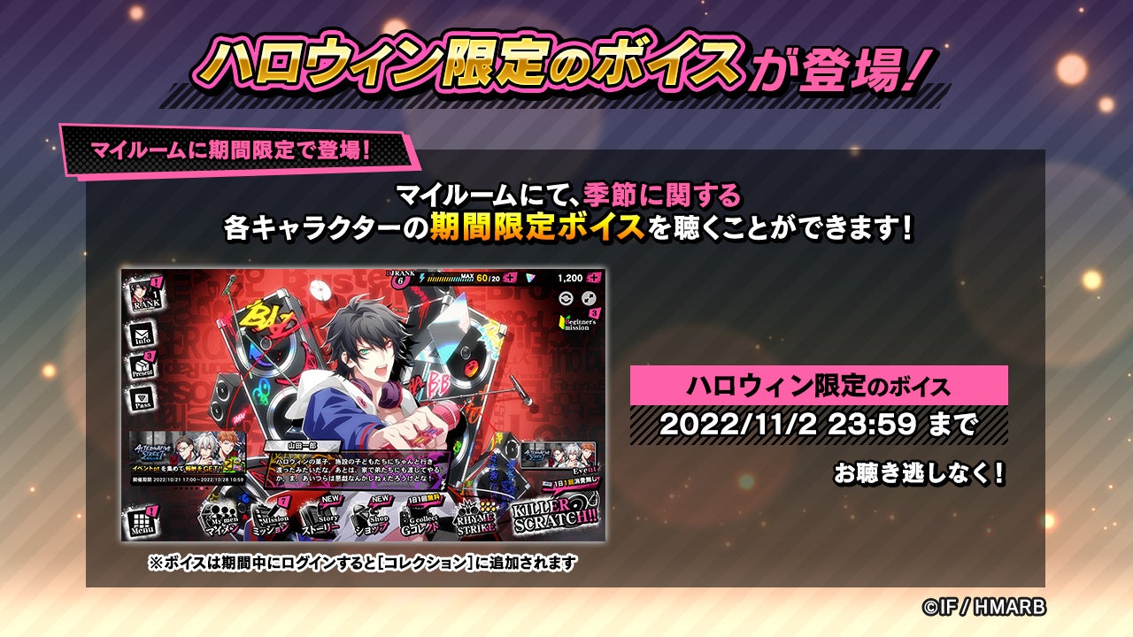 期間中、マイルームでハロウィンをテーマにした期間限定ボイスを聴くことができます。また、期間中にログインすると該当ボイスは「コレクション」内のそれぞれのキャラクターページでいつでも視聴することが可能になります。ぜひアプリにアクセスしてみてください。