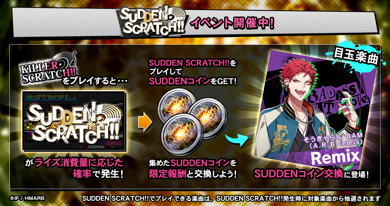 イベント期間中、KILLER SCRATCH!!をプレイするとライズ消費量に応じた確率でSUDDEN SCRATCH!!が発生します。SUDDEN SCRATCH!!をプレイすると、通常の報酬アイテムの他、限定アイテム「SUDDENコイン」を獲得することができます。「SUDDENコイン」を集めることで、新楽曲「そうぎゃらん BAM(A.R.B remix)」と交換することが可能です。詳細はアプリ内お知らせをご確認ください。