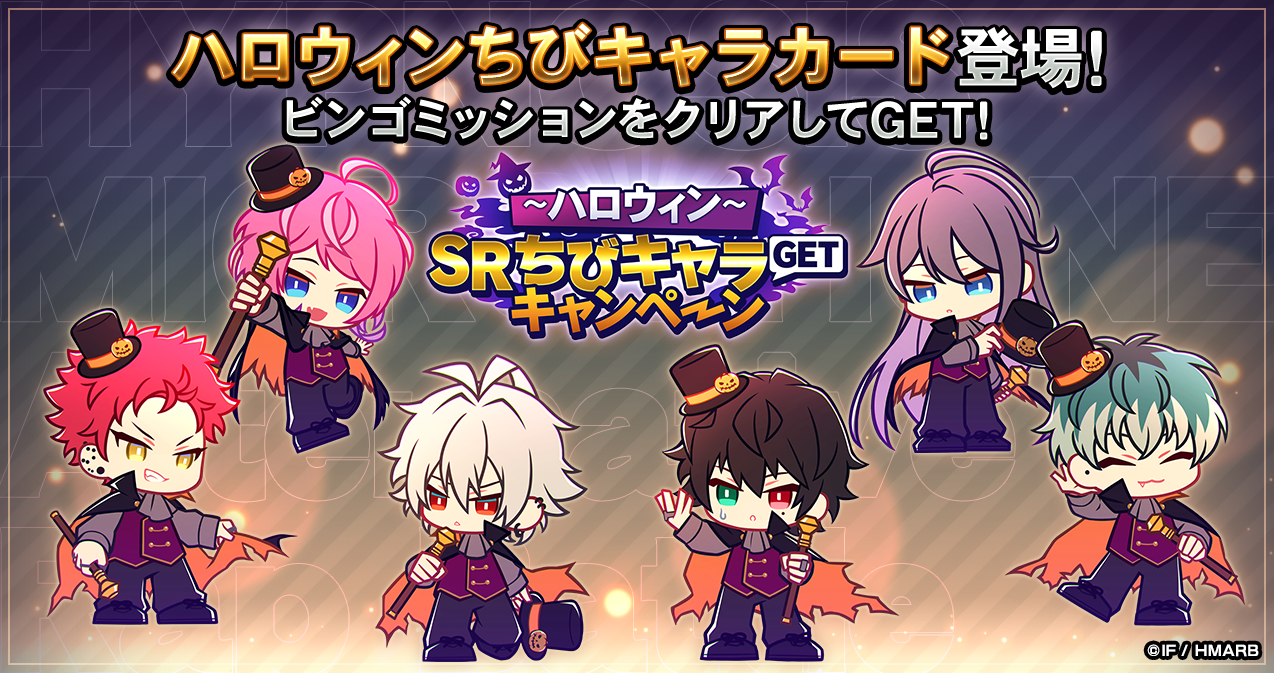 期間中、一郎・左馬刻・乱数・寂雷・簓・空却の【とりっくおあとりーと】シリーズのカードや、「ジェム」を獲得することができるミッションを開催中です。また、当日になるまで中身がわからないミステリーログインボーナスも同時開催中です。詳細はアプリ内お知らせをご確認ください。