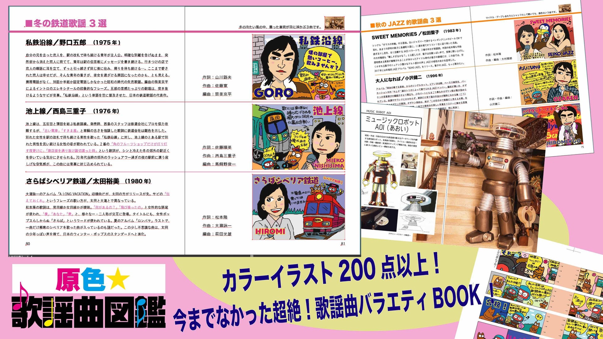 「原色★歌謡曲図鑑」は、Amebaブログで連載中の人気歌謡曲ブログ。今までありそうでなかった、歌謡曲をテーマにしたイラスト・コラムが、歌謡曲ファンを唸らせている。新刊には、連載195回分を収録。昭和・平成・令和の歌謡曲・シティポップを、200点以上のオリジナル・イラストと写真で超選曲した「歌謡曲バラエティBOOK」になっている。