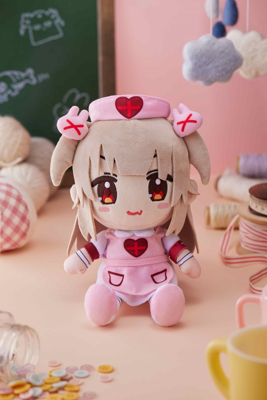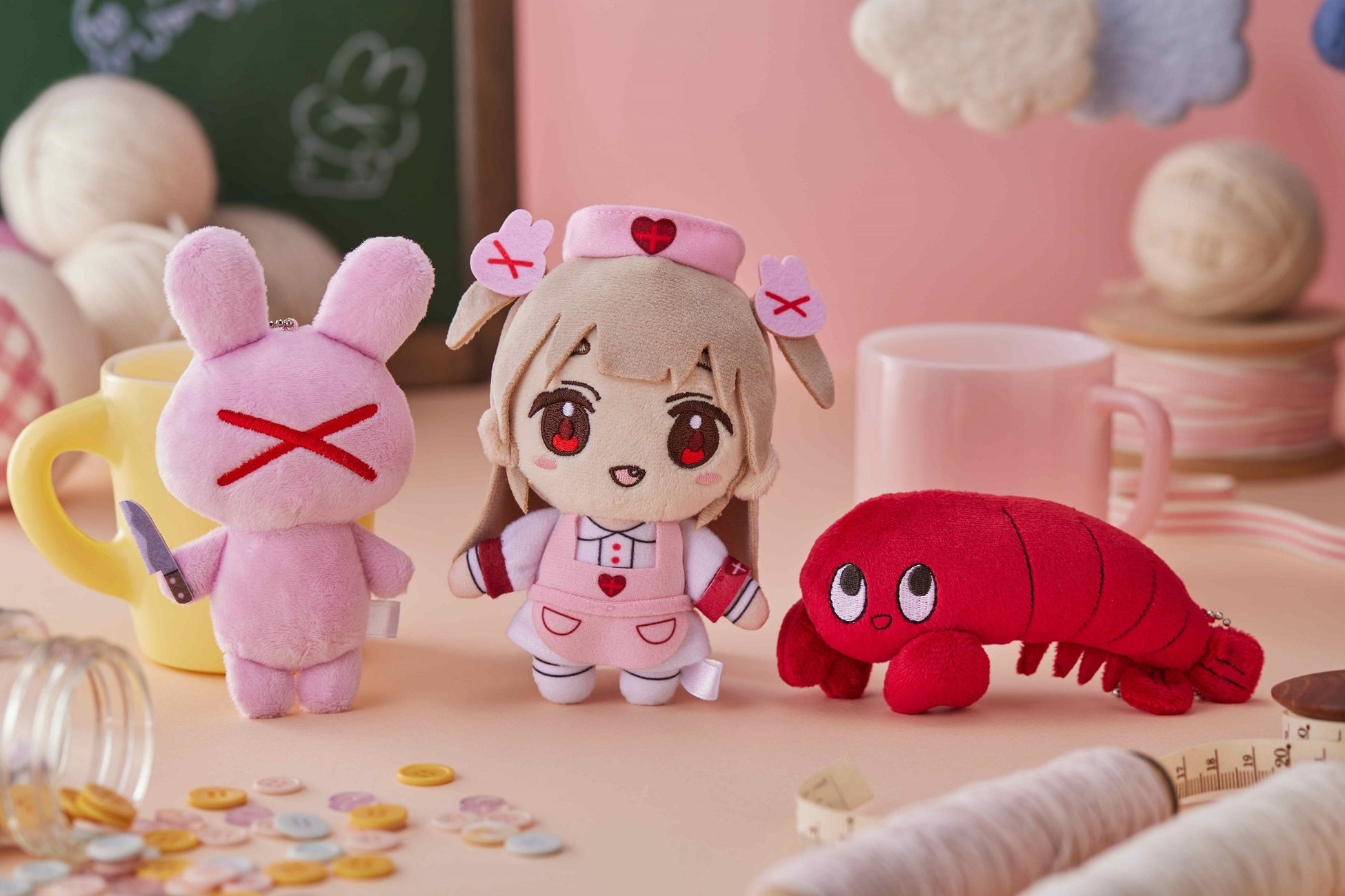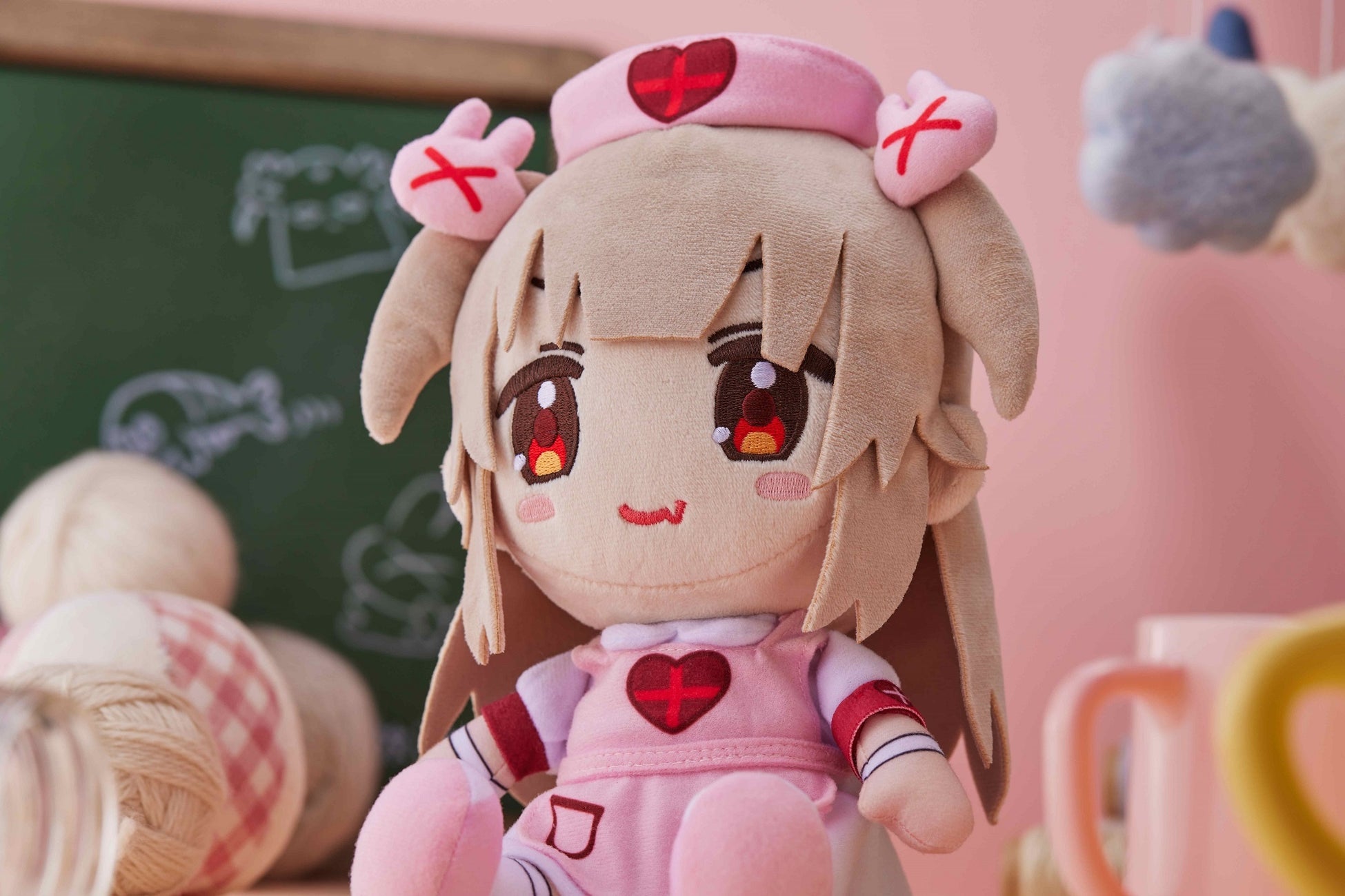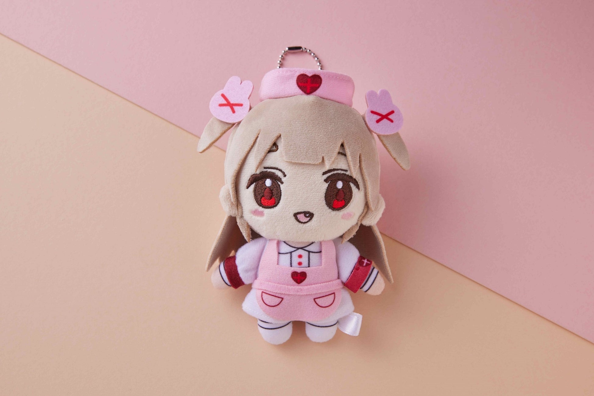 「名取さな」のおすわりぬいぐるみが登場! 白いワンピースにピンクのエプロン、ハートに十字がデザインされたナース帽、そしてうさちゃんせんせえの髪留めなど細部にわたってしっかり再現されています。