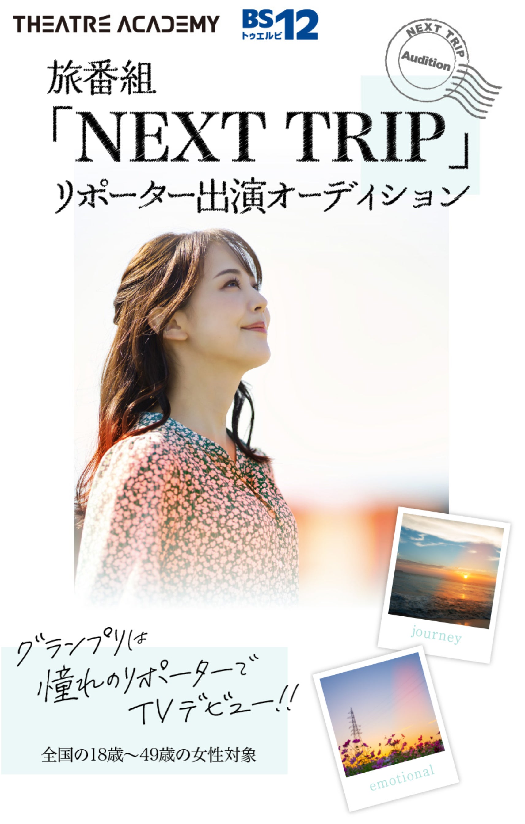 1980年の創業以来、さまざまな分野で活躍できるタレントを輩出し続けてきたテアトルアカデミーと、ダイナミックな映像とともにナビゲーターが現地の魅力を伝えるBS12の旅番組「NEXT TRIP」とのコラボオーディションです。